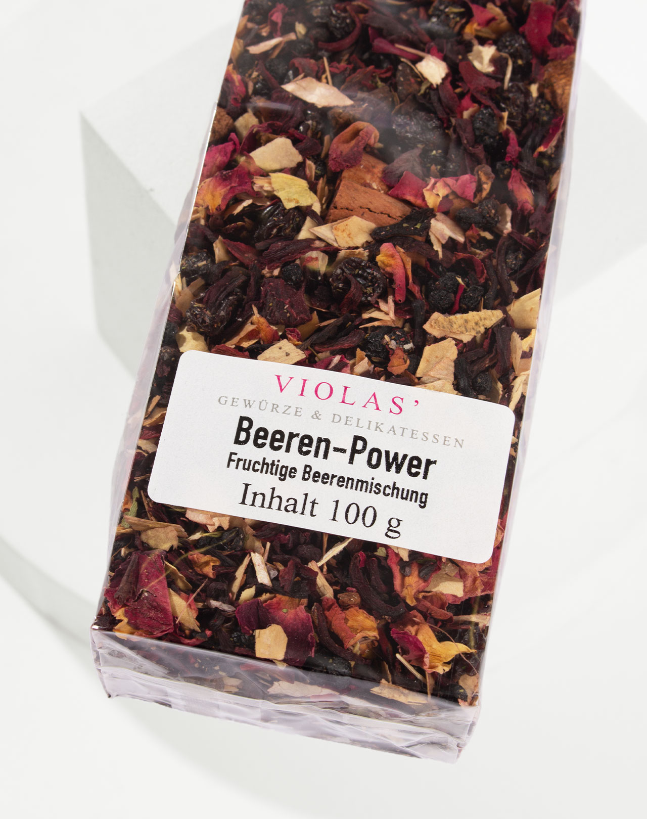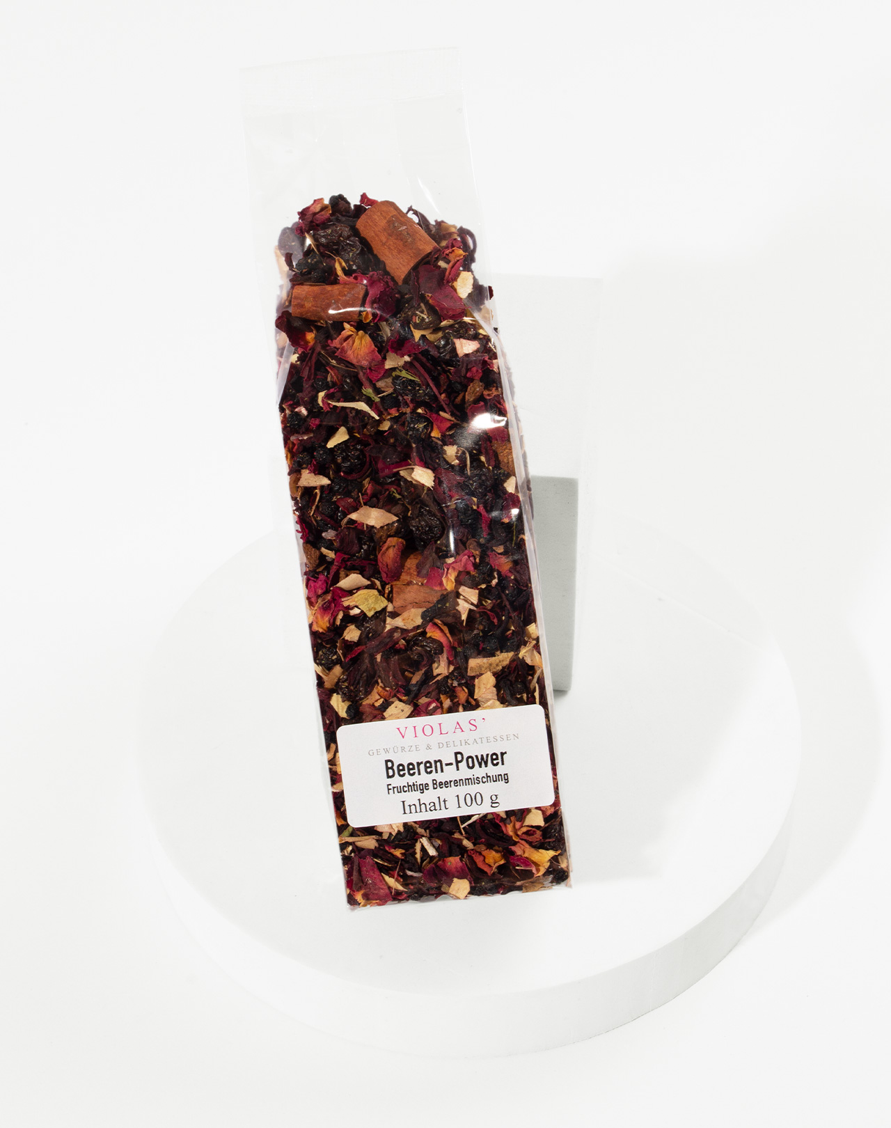 Hibiskus, geölte Korinthen (Korinthen, Sonnenblumenöl), Holunderbeeren, weiße Bohnenschalen, geröstete Zichorienwurzel, Rote Bete, Cassiarinde, natürliches Aroma, Süßkraut, Rosenblütenblätter