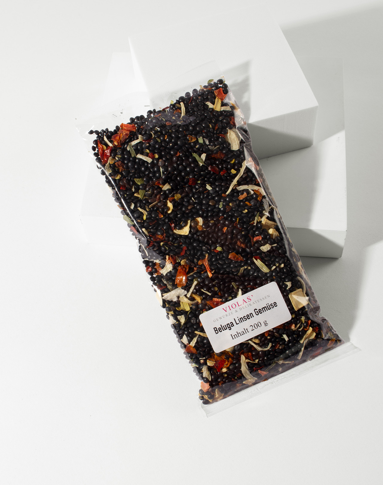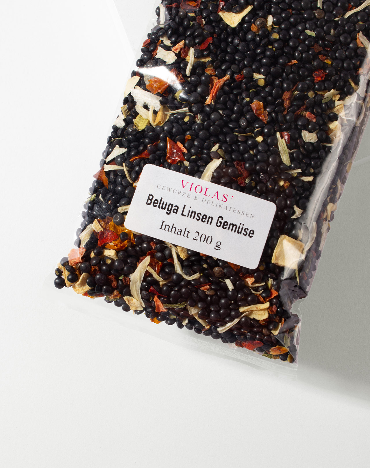 Beluga Linsen (91%), Tomate 4,5%, Suppengrün 2% (Lauch, Karotte, Pastinake), Chili, Zwiebeln