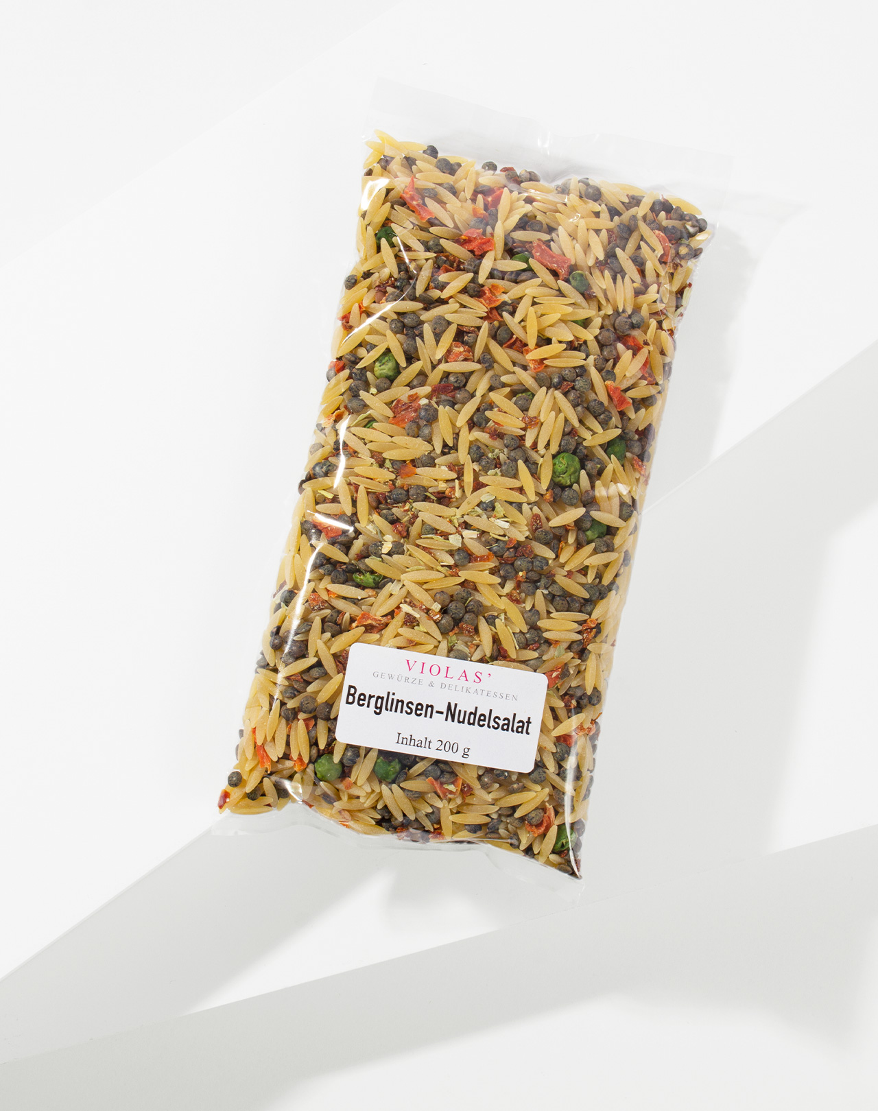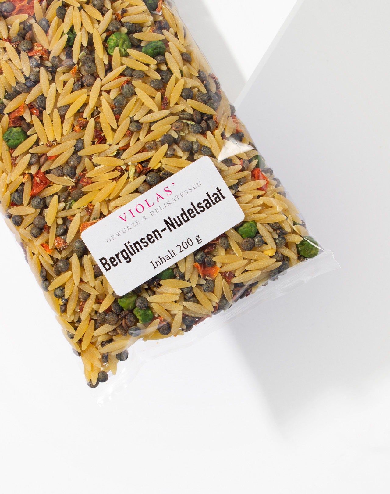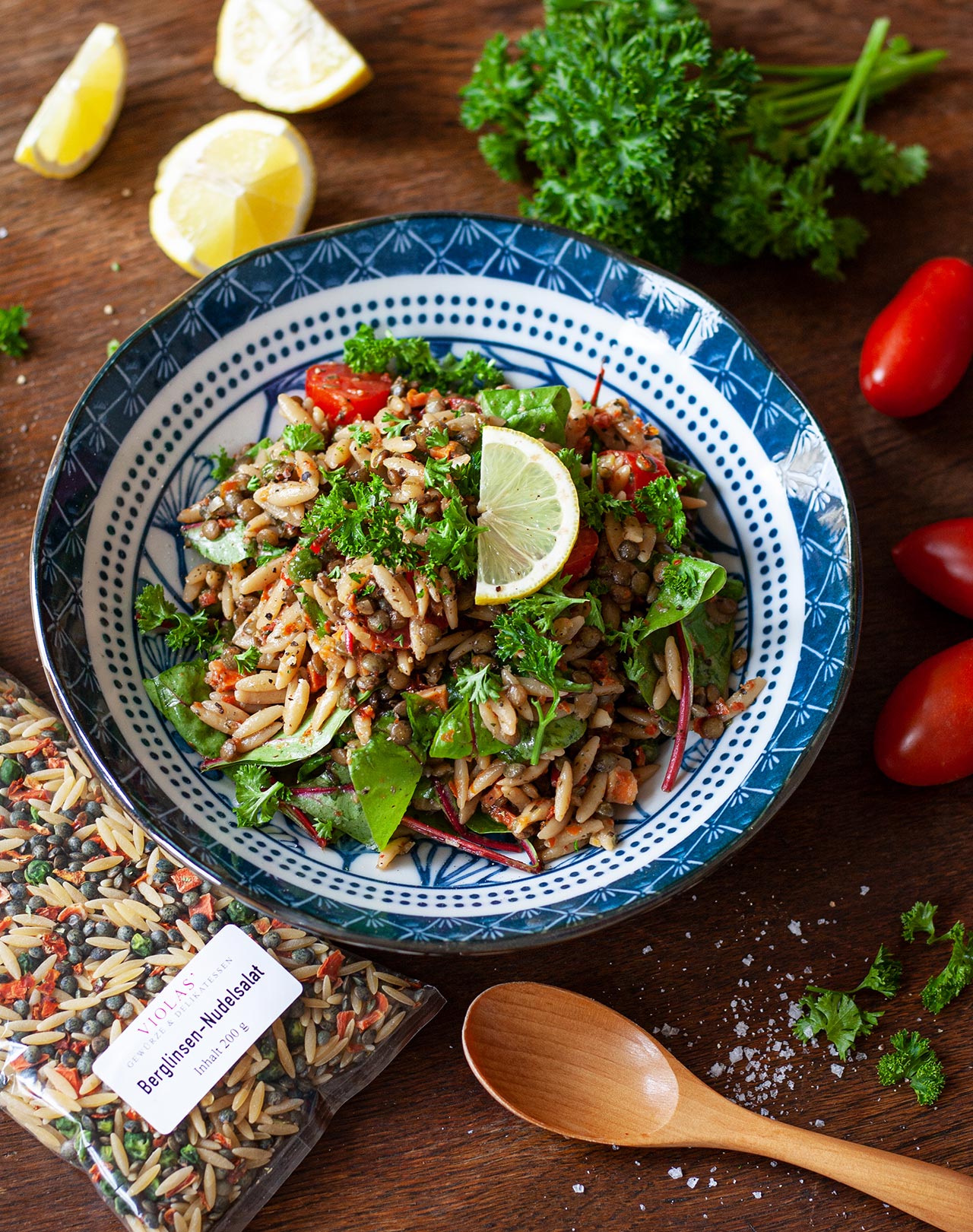 Diese Mischung aus nussigen Berglinsen und Kritharaki, den kleinen griechischen Reiskornnudeln, ist ausgesprochen lecker: Wir haben den Mix mit Thymian, Basilikum und feinen Gemüsestückchen mediterran abgeschmeckt – so lässt sich daraus mit einer Vinaigrette schnell ein sättigender Salat zaubern, den Sie ganz nach Gusto mit knackigem Gartengemüse, Schafskäse oder frischen Kräutern ergänzen können.
