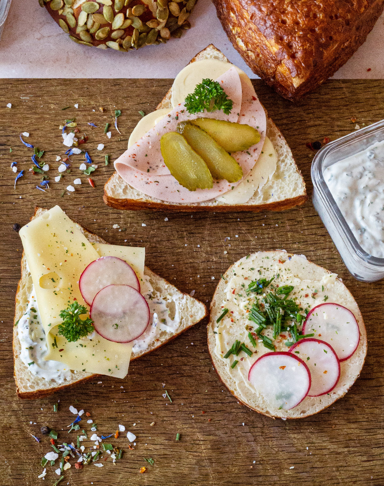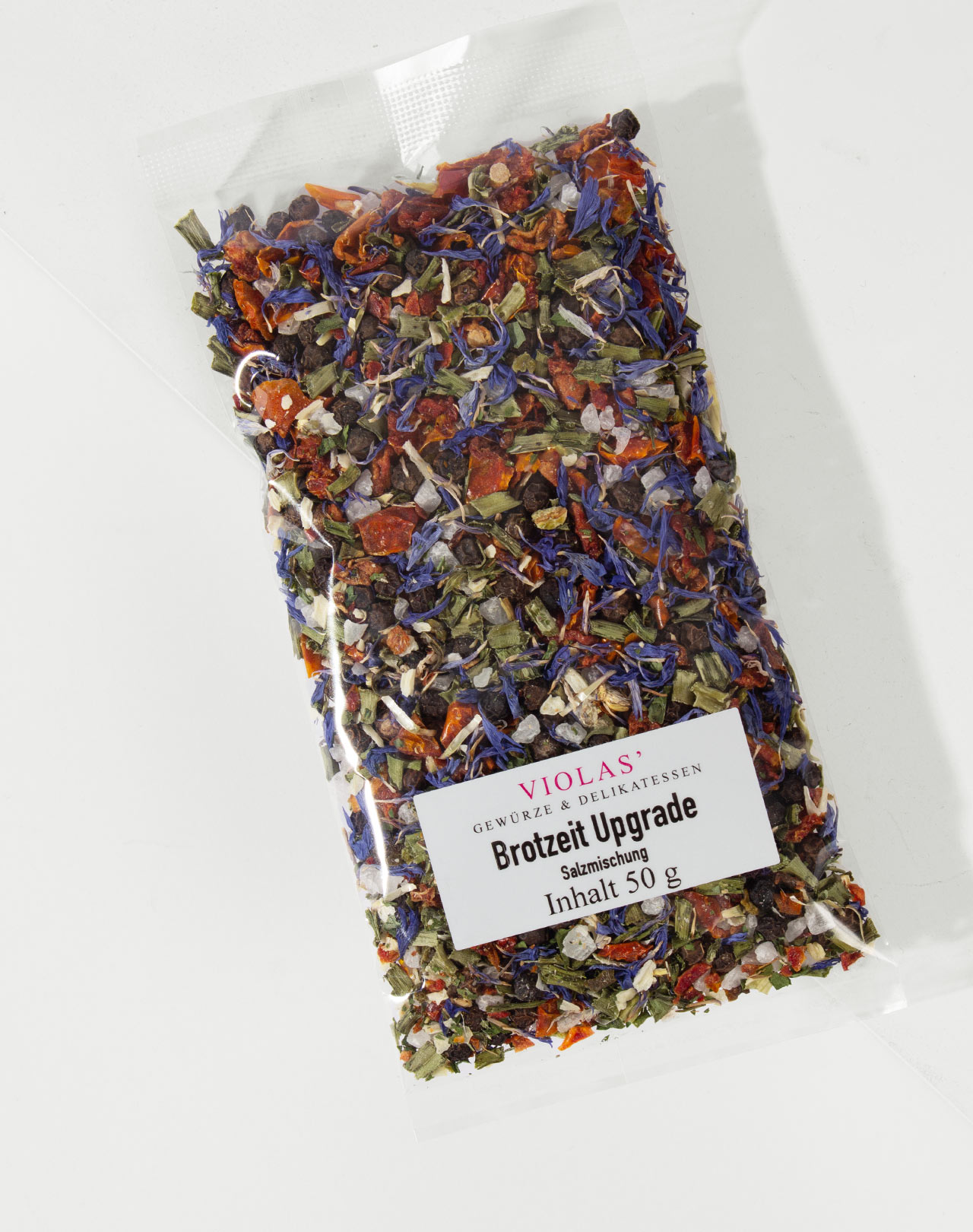 Salz, Pfeffer schwarz, Zwiebeln, Tomaten, Paprika rot, Paprika grün, Schnittlauch, Petersilie, blaue Kornblumen