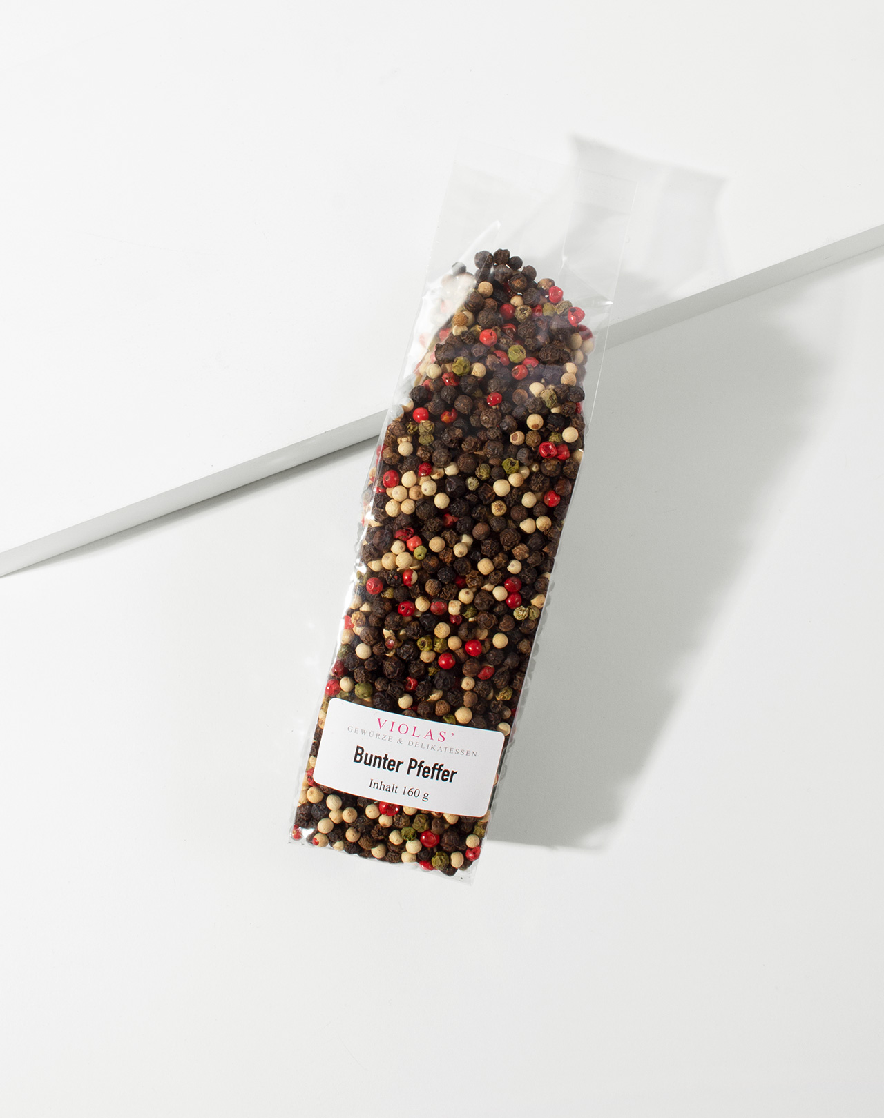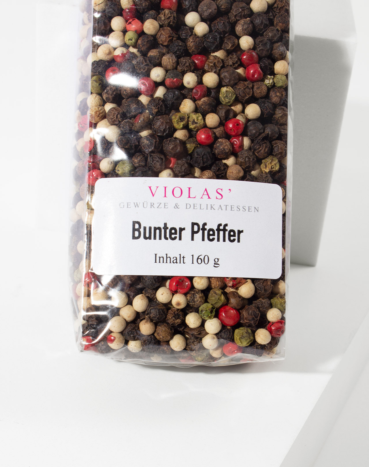 Pfeffer ist nicht gleich Pfeffer. In dieser Mischung »Bunter Pfeffer« finden sich gleichvier Sorten Pfeffer von höchster Qualität mit unterschiedlichen Eigenschaften, die im Zusammenspiel eine einzigartige Pfeffernote ergeben. Aromatischer schwarzer Pfeffer aus Vietnam, kräftiger weißer Pfeffer und die fruchtigen Buketts von grünem und rosa Pfeffer.