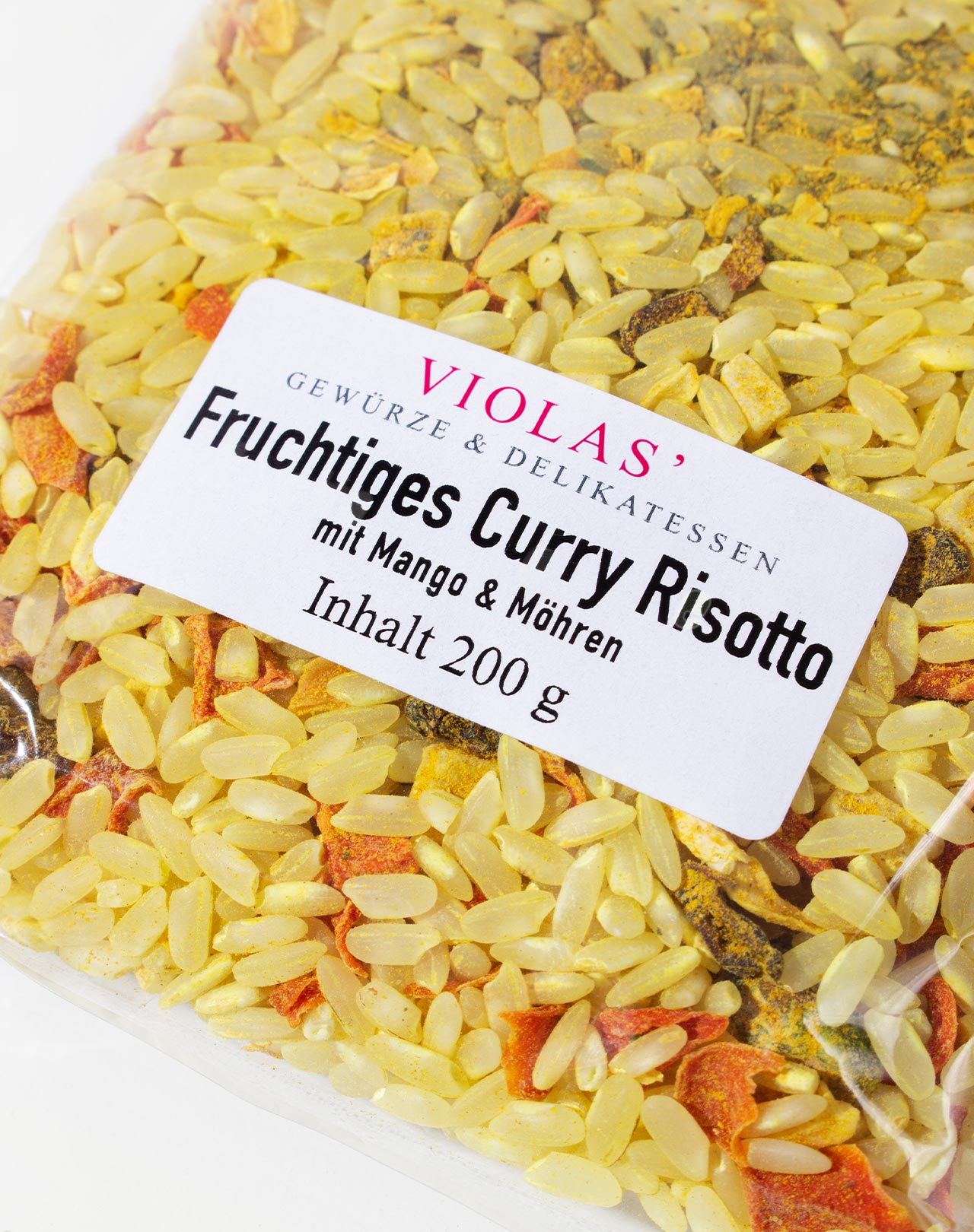 Risottoreis 73%, Mangowürfel 8,8%, Möhren 6,1%, PISTAZIEN, Curry 2,4% (Kurkuma, Coriander, Kichererbse, SENF, Pfeffer, Salz, Bockshornkleesamen, Knoblauch, SELLERIE, Chili, Zimt, Cumin ), Berberitzen, Zwiebeln, Petersilie.