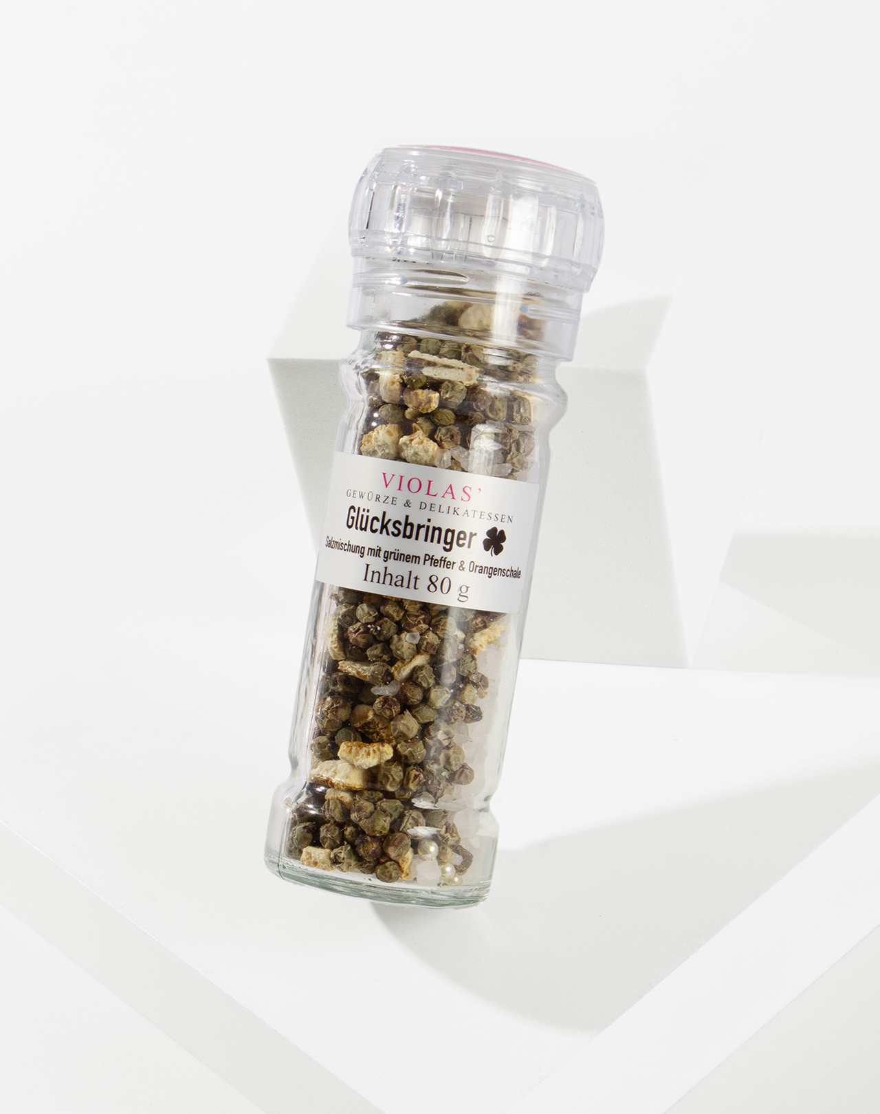 Unsere Glücksbringer Mühle ist eine tolle Salzmischung, die grünen Pfeffer und feine Orangenschale kombiniert. Diese besondere Mischung verleiht Ihren Gerichten eine harmonische Balance aus würziger Schärfe und fruchtiger Frische. Perfekt zum Verfeinern von Fleisch, Fisch, Gemüse und Salaten. Diese Mühle ist nicht nur ein praktischer Küchenhelfer, sondern auch eine tolle Geschenkidee für Genießer und Feinschmecker. Verschenken Sie ein bisschen Glück!