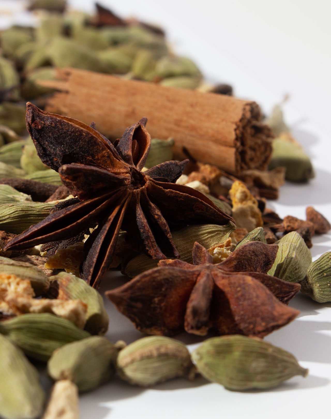 Cardamom, Cassia Zimt, Orangenschale, Zimtstangen, Sternanis, Zitronenschale, Nelken.