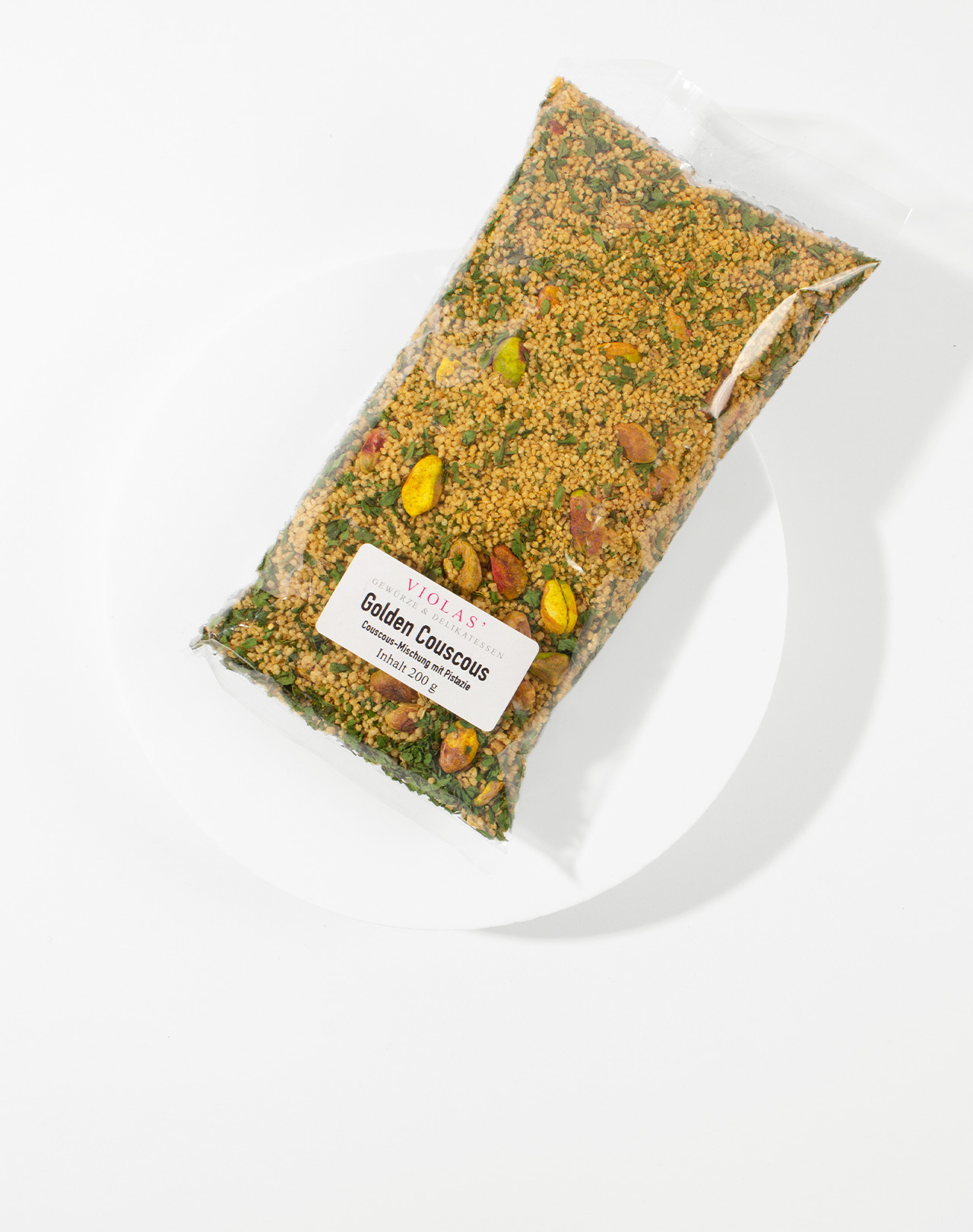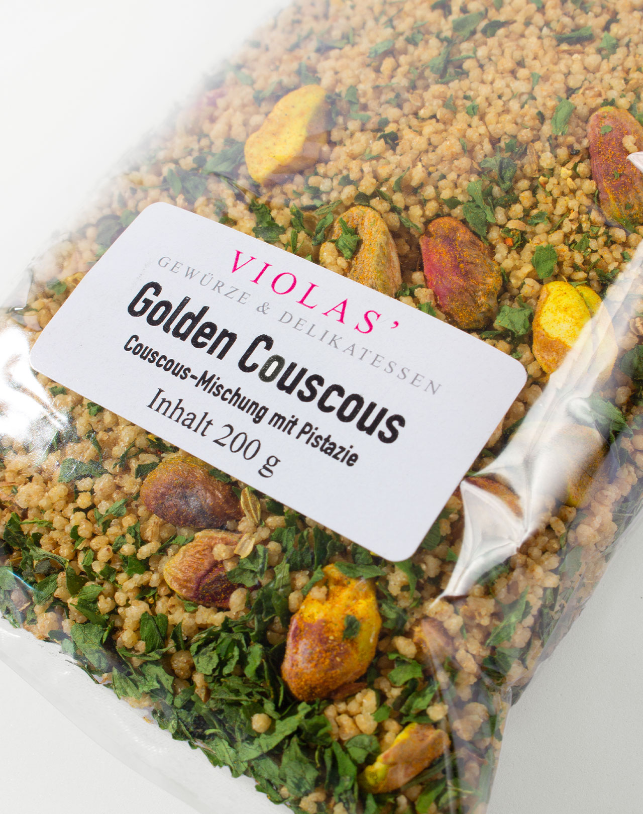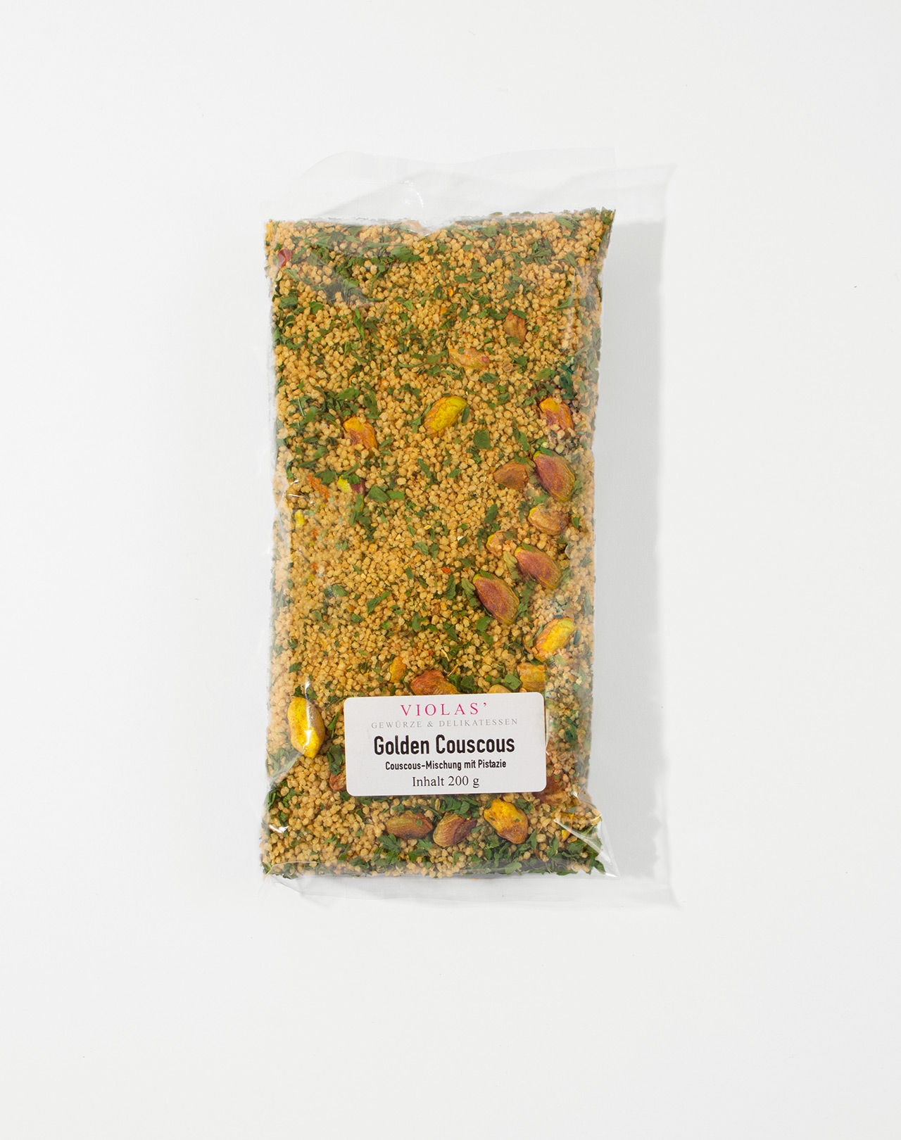 Couscous (81 %), PISTAZIEN (13,5 %), Curry- Gewürzzubereitung (Koriander, Kurkuma, Pfeffer, Orangenschale, Cumin, Knoblauch, Zimt, Kardamom, Bockshornklee, Fenchel, Ingwer, Chili, Nelken), Petersilie