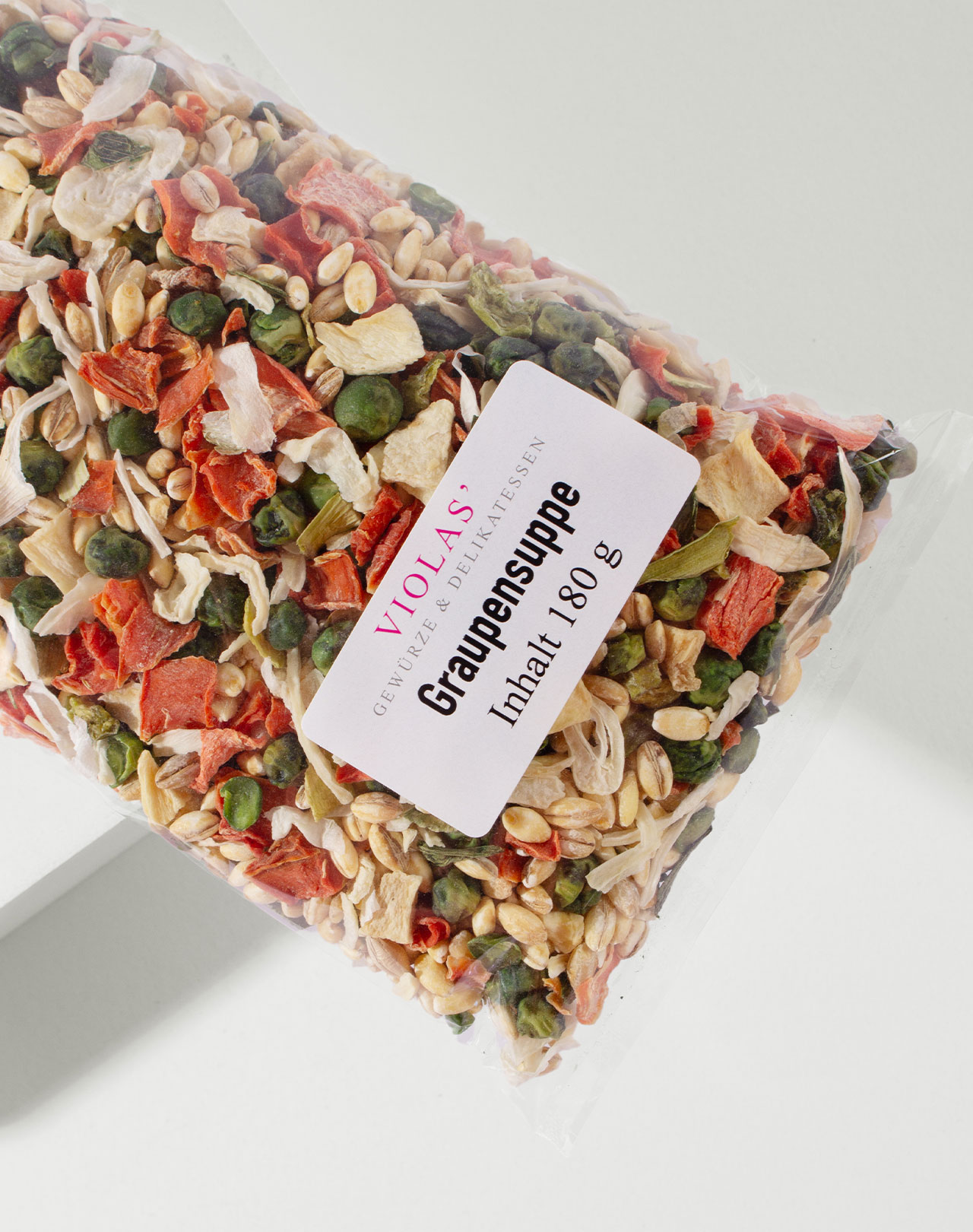 Graupen sind geschälte Gersten- oder Weizenkörner und ergeben zusammen mit Suppengemüse und Brühe eine herzhafte, sättigende Suppe. Einfach den Beutelinhalt mit 1,5 l Gemüsebrühe zum Kochen bringen und ca. 45 Minuten bei niedriger Hitze köcheln lassen. Nach Belieben mit Salz und Pfeffer abschmecken.