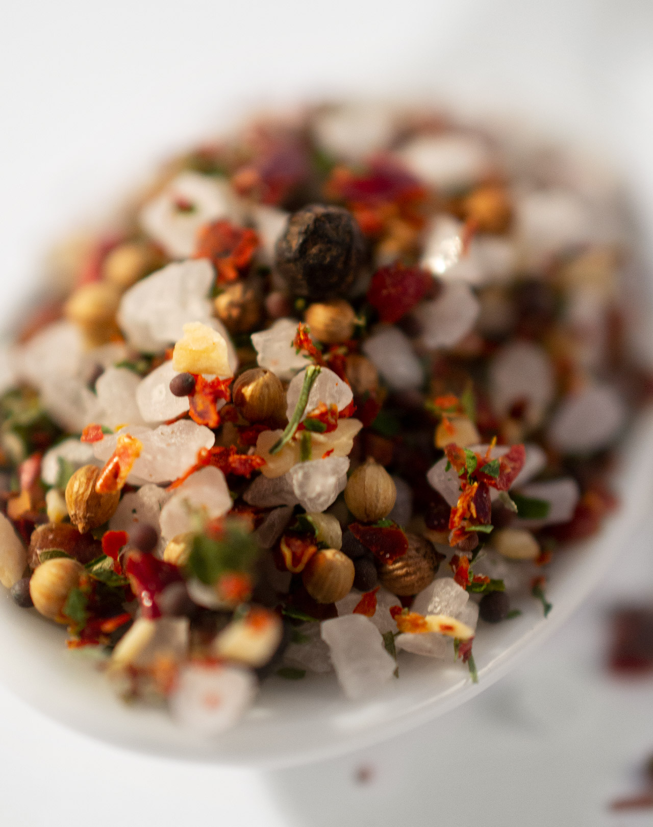 Meersalz (68%), Pfeffer, SENF, Paprika, Koriandersaat, Knoblauch, Chili, Petersilie