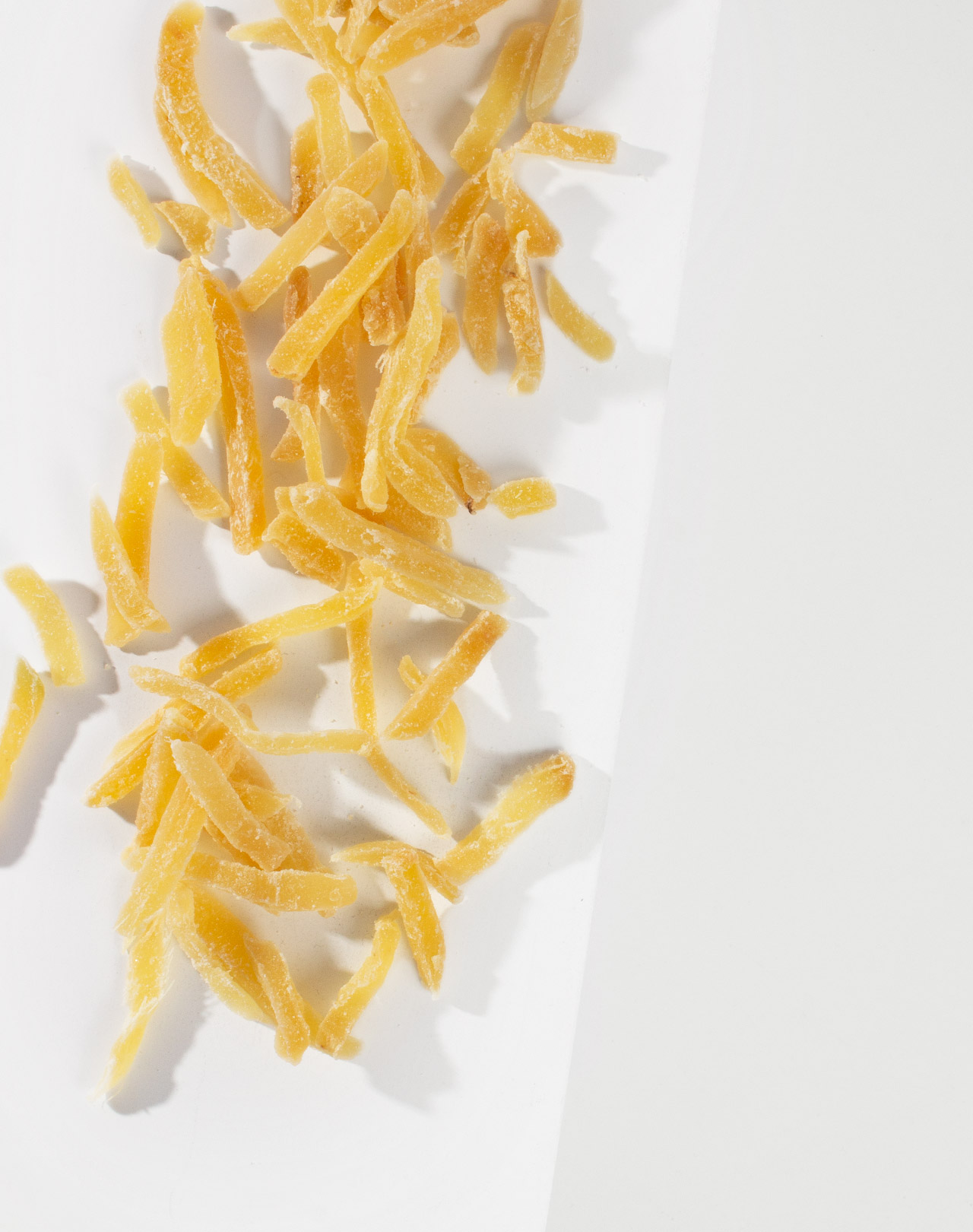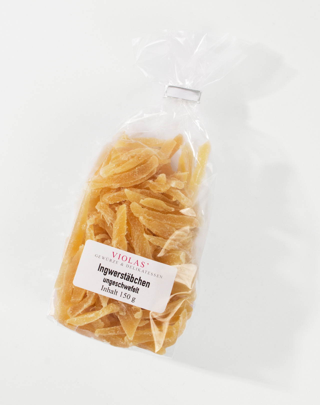 Unsere kandierten Ingwerstäbchen begeistern jeden Feinschmecker, der die Verbindung von süß und scharf liebt. Diese Ingwerstäbchen sind ungeschwefelt und eignen sich nicht nur zum Naschen, sie sind auch für die Verfeinerung von Kuchen und Gebäck geeignet. Sogar ein leckerer Tee lässt sich damit bereiten.