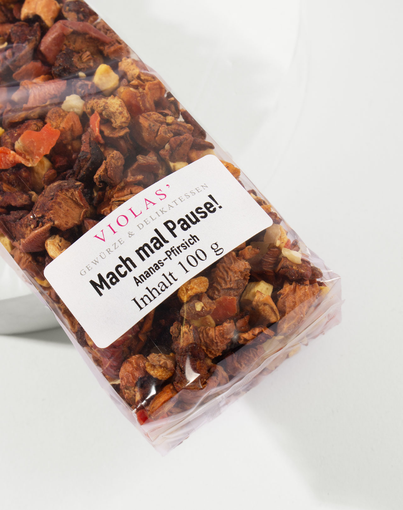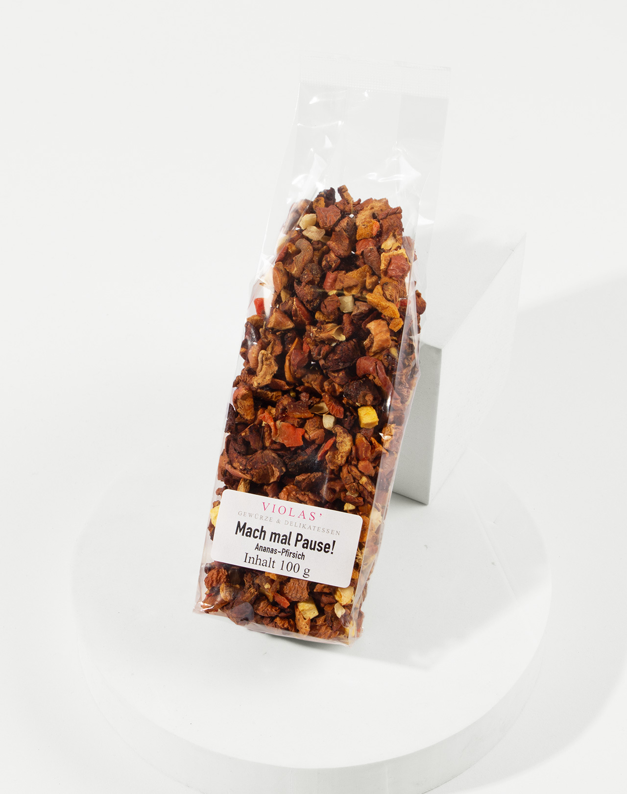 Unsere Mischung »Mach mal Pause« überzeugt durch sorgfältig kombinierte Fruchtaromen wie Ananas, Papaya, Pfirsich, Mango und Passionsfrucht. Schon der Duft betört und entführt gedanklich in warme Gefilde. Einer kleine Auszeit für alle Liebhaber exotischer Früchte.