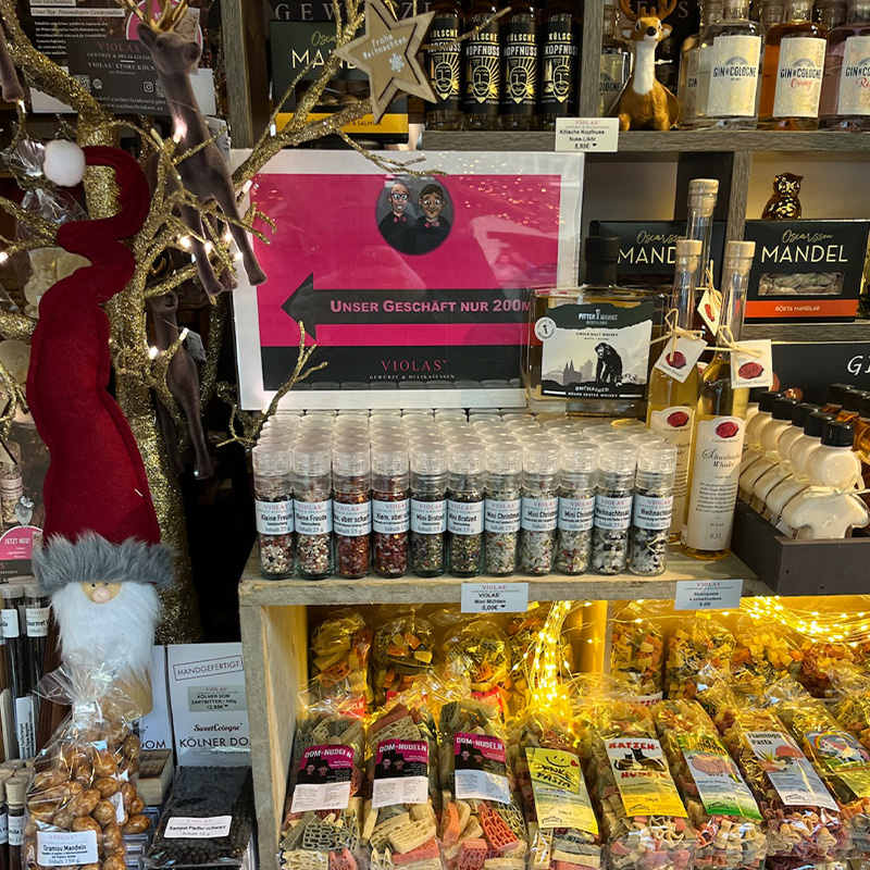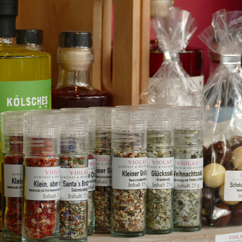 Seit 2017 gehören wir Podorfs mit VIOLAS’ zur bunten und lebensfrohen Stadt Köln und sorgen mit Begeisterung und sehr viel Sorgfalt dafür, das Besondere der VIOLAS' Produkte unseren Kunden ans Herz zu legen. Mit exotischen Gewürzen und außergewöhnlichen Köstlichkeiten begeistern wir Hobbykoch und Delikatessenliebhaber. Unser Sortiment reicht von unzähligen Gewürzen aus der ganzen Welt, eigenen, handgefertigten Gewürzmischungen, erlesenen Ölen und Essigen, über Pasta-, Risotto- und Reismischungen bis hin zu köstlichen Schokoladen oder ausgefallenen Spirituosen – zum Selbstgenießen oder Verschenken. Kunden, die ein passendes Geschenk gefunden haben, können es sich gleich liebevoll verpacken lassen.