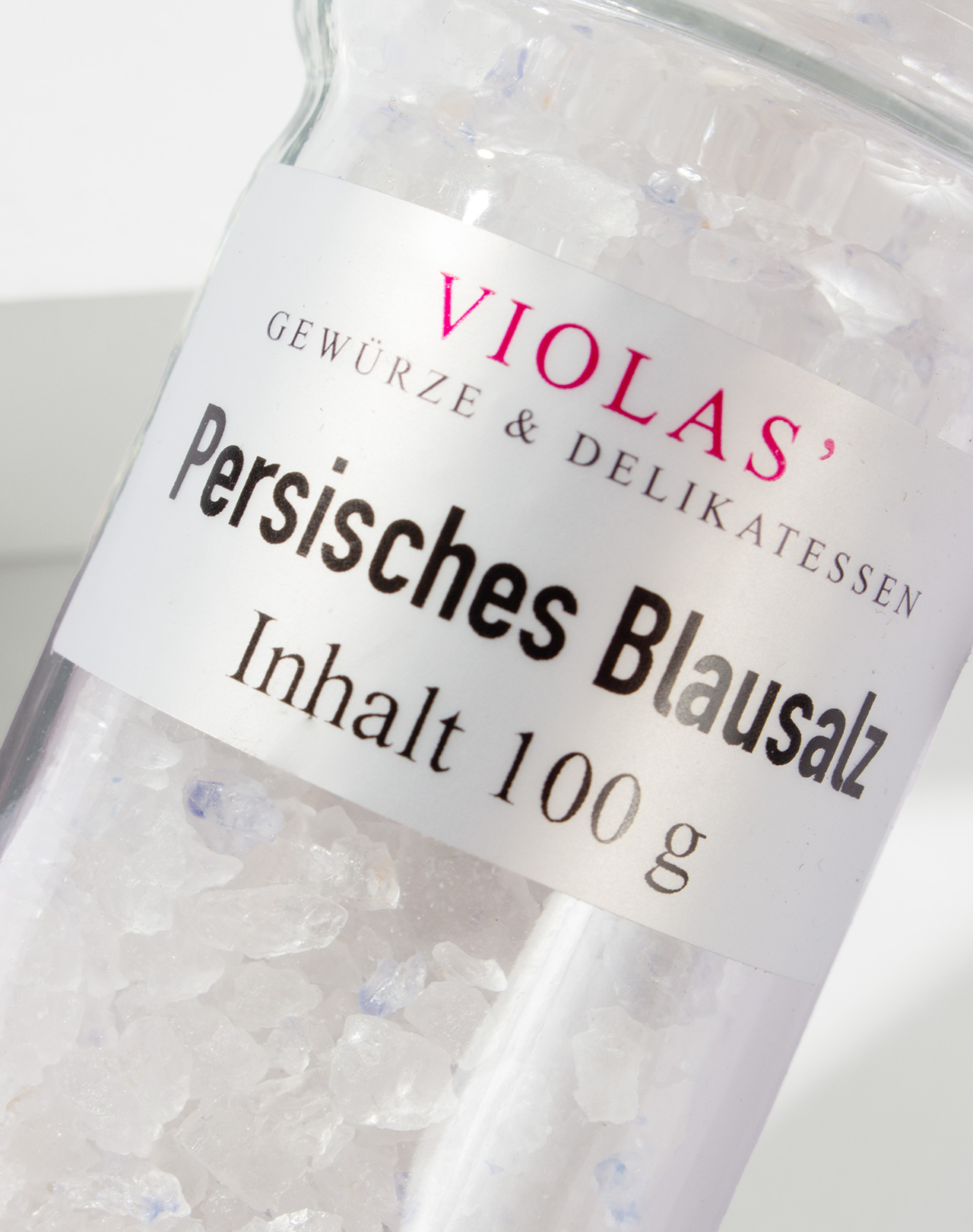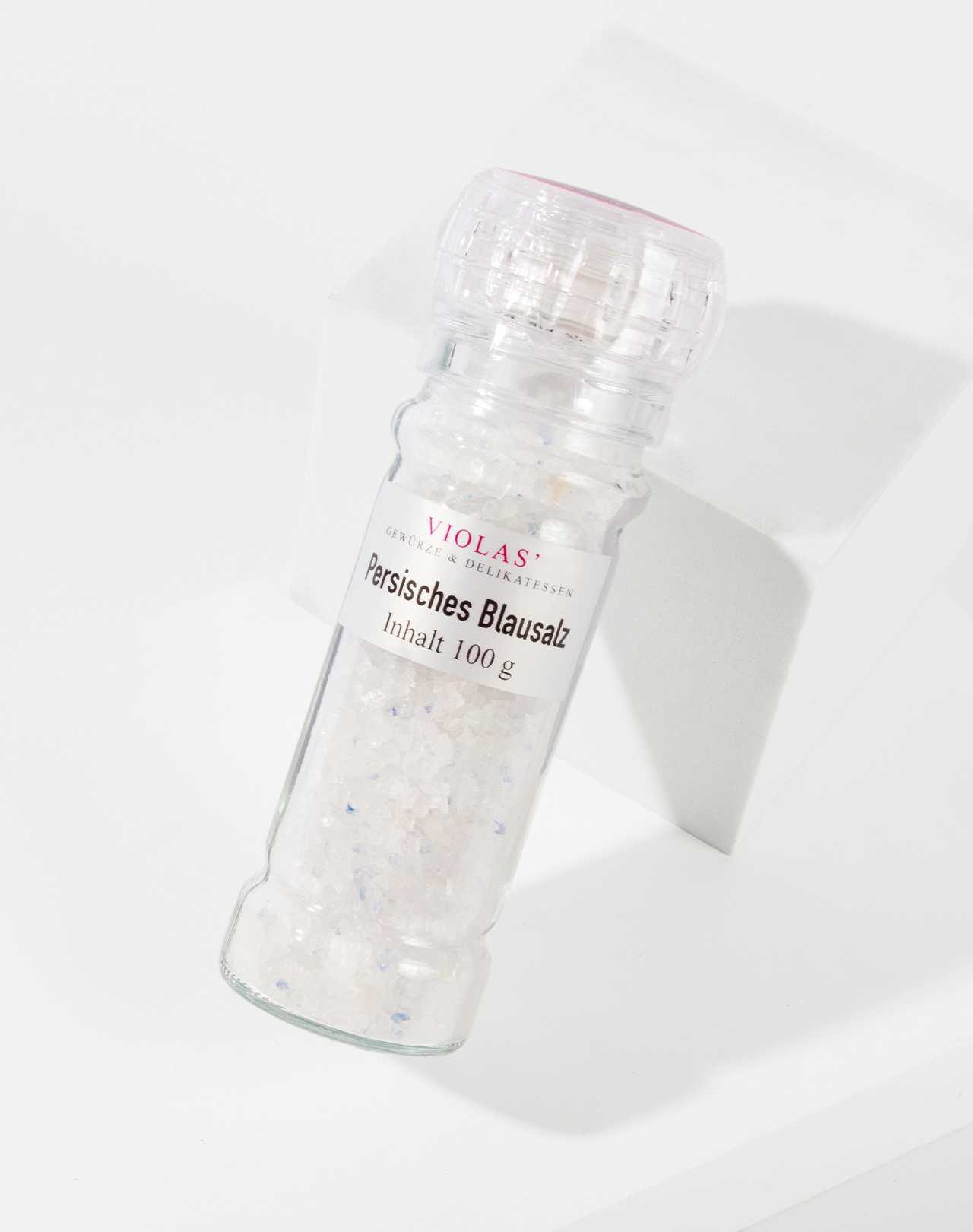Das seltene Persische Blausalz ist ein Steinsalz, welches in einer Provinz namens "Semnan" im Iran gewonnen wird. Dieses sehr intensive Salz erhält seine Farbe durch eine Kristallverschiebung im Salz. Aufgrund des hohen Anteils an "Kaliumchlorid" schmeckt das Salz im ersten Moment sehr intensiv, doch im Nachgeschmack ist es sehr mild. Passt ausgezeichnet zu Meeresfrüchten, Kalb, Lamm und Trüffelgerichten.