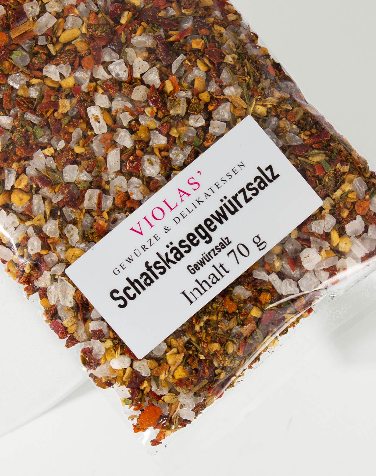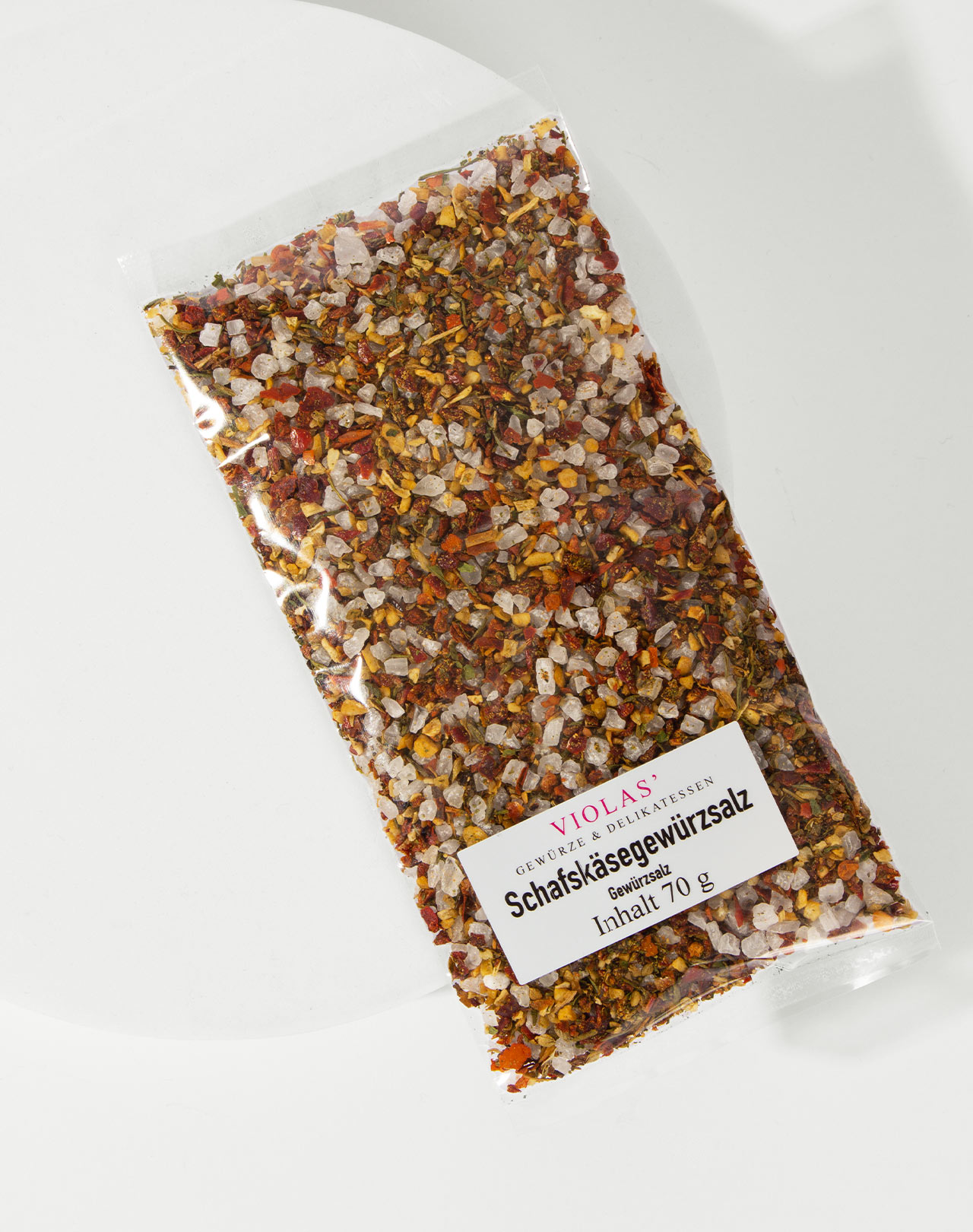 Meersalz. Schafskäsegewürz (Knoblauch, Paprika, Chili, Pfeffer, Petersilie, Zwiebeln, Thymian, Oregano, pflanzliches Öl, Basilikum)