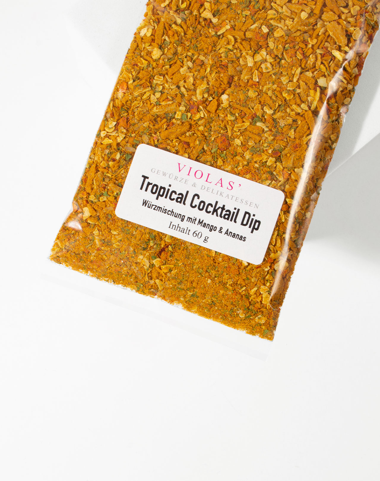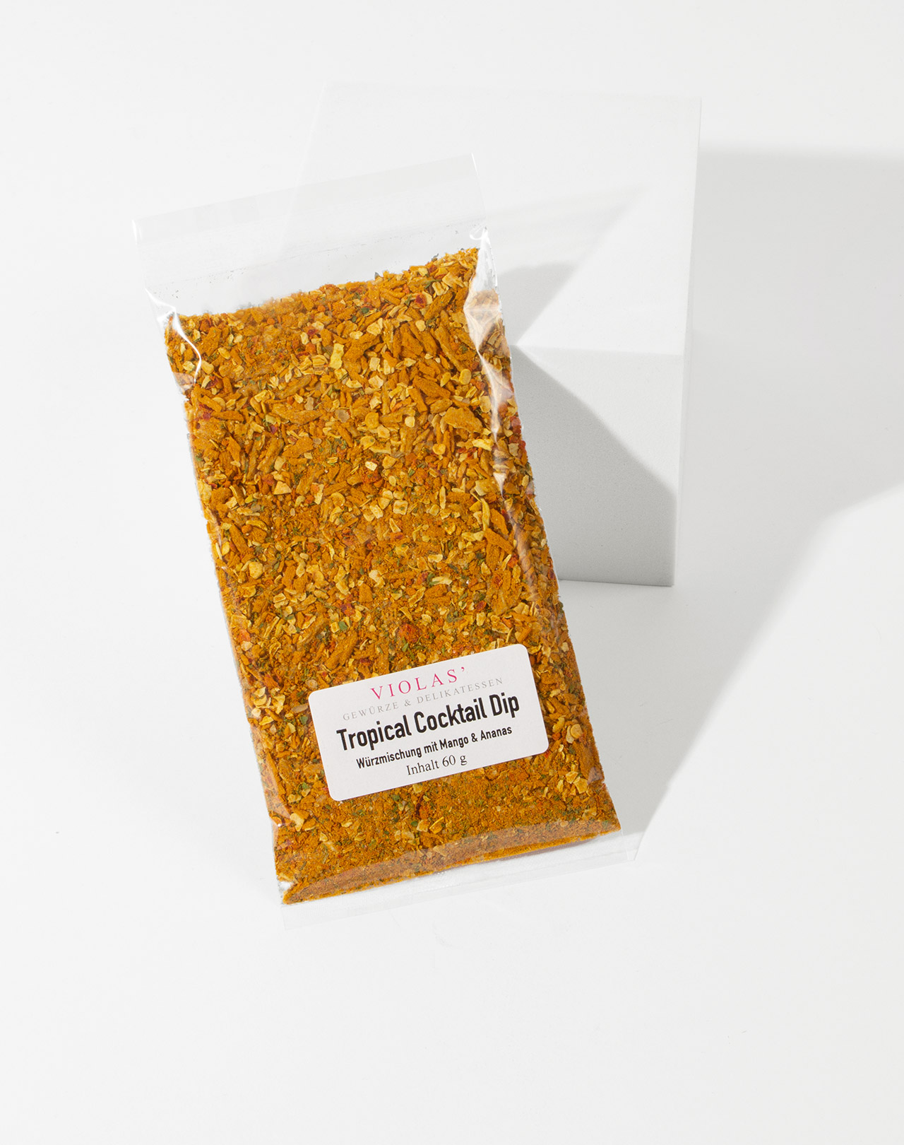 2 – 3 Teelöffel dieser Mischung in Mayonnaise oder Crème fraîche einrühren und fertig ist ein fruchtiger Dip, der nach Mango und Ananas schmeckt. Eine pikante Note erhält die Sauce durch zahlreiche Gewürze, wie Zwiebeln, Chili, Koriander, Petersilie. Der Dip passt zu Brot oder Gemüsestreifen und ist auch als Basis für einen Shrimps Cocktail oder Geflügelsalat wunderbar geeignet.