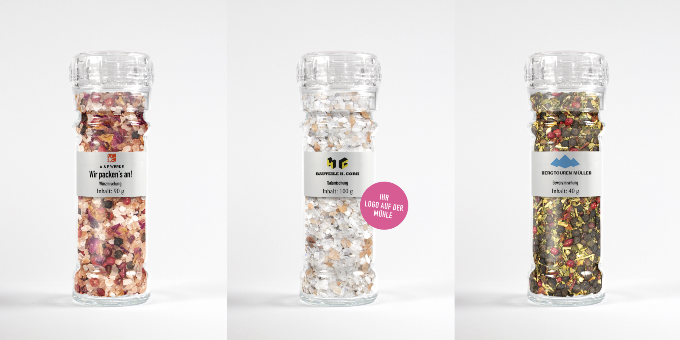 Eine Gewürzmühle mit individuell gestaltetem Etikett ist nicht nur ein kulinarischer Küchenhelfer, sondern auch ein ausgezeichnetes Werbemittel oder eine schöne Aufmerksamkeit für Ihre Mitarbeiter. Wir bieten Geschenkideen für Geschäftspartner, Mitarbeitergeburtstage, Jubiläen, Feiertage und viele weitere Gelegenheiten. Ab einer Abnahmemenge von 50 Mühlen bieten wir eine Individualisierung mit Wunschtext und Firmenlogo an. Durch die Personalisierung mit Ihrem Firmenlogo oder einer individuellen Botschaft wird die Mühle zu einem einzigartigen Geschenk, welches lange im Gedächtnis bleibt. Jede Nutzung führt zu einem Kontakt mit Ihrer Marke.