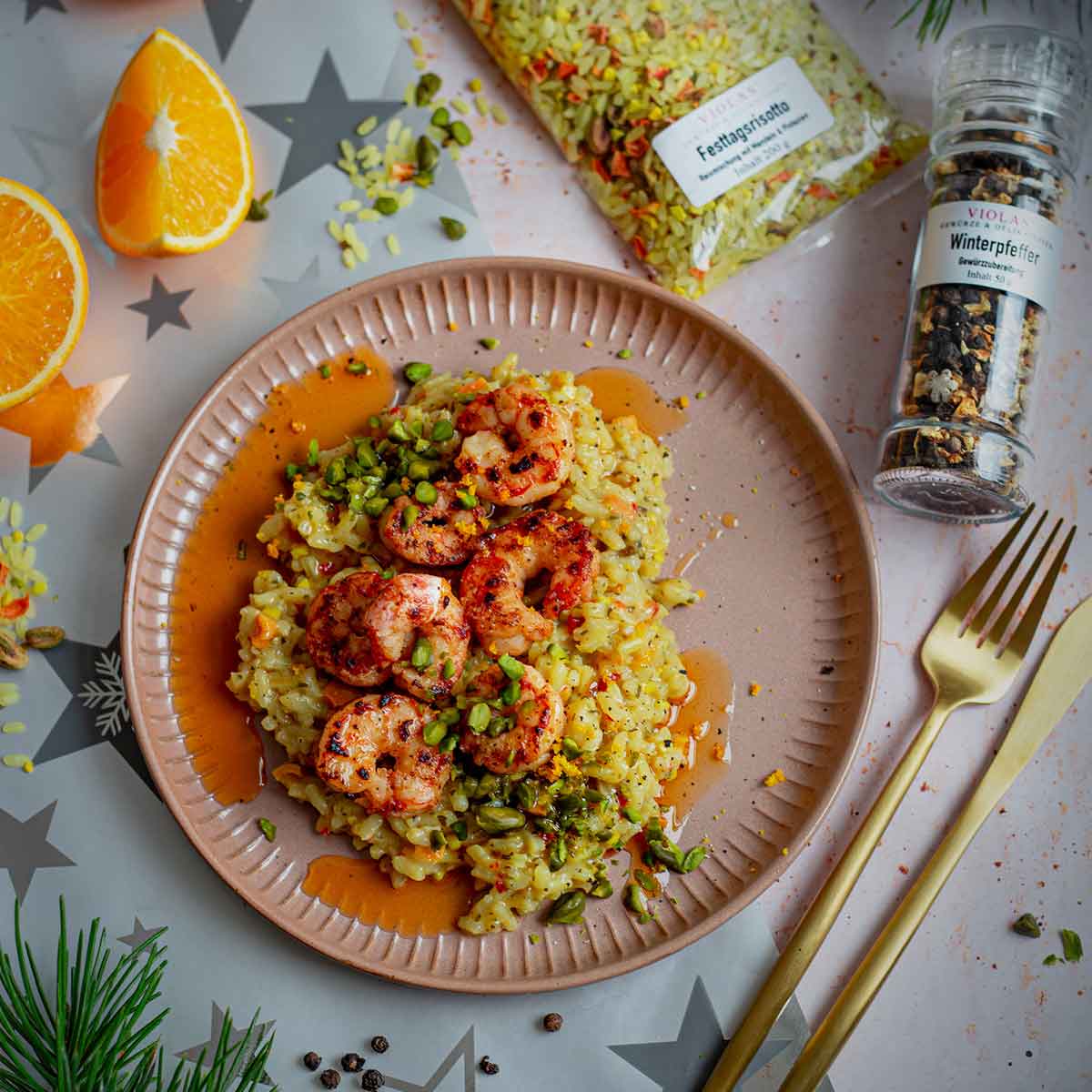 Planen Sie auch schon das Menü für das Weihnachtsessen? Da hätten wir eine Idee für Sie: Das cremige VIOLAS’ Festtagsrisotto als Vorspeise oder Beilage zum Hauptgericht – mit Pistazien, Mandeln, roter Paprika, Petersilie und vielem mehr – ist geschmacklich und optisch genau das Richtige. Veredelt mit Scampi wird das Festtagsrisotto zu einer eleganten Hauptspeise, die wirklich Eindruck macht.
