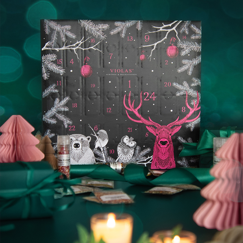 Für uns ist der schönste Adventskalender der, der mit Liebe selbst gemacht und individuell mit schönen und leckeren Kleinigkeiten befüllt worden ist. Deshalb haben wir für diesen Zweck einige unserer beliebtesten und leckersten Gewürzmischungen in kleine Portionen abgefüllt – so passen die kleinen Tütchen in jedes Adventskalender-Säckchen oder -Kästchen und bringen garantiert Freude und Abwechslung auf den Tisch. Und auch in diesem Jahr gibt es bei uns eine Besonderheit: Unseren »VIOLAS’ Adventskalender« im charmanten Retrodesign – ein echter Hingucker!