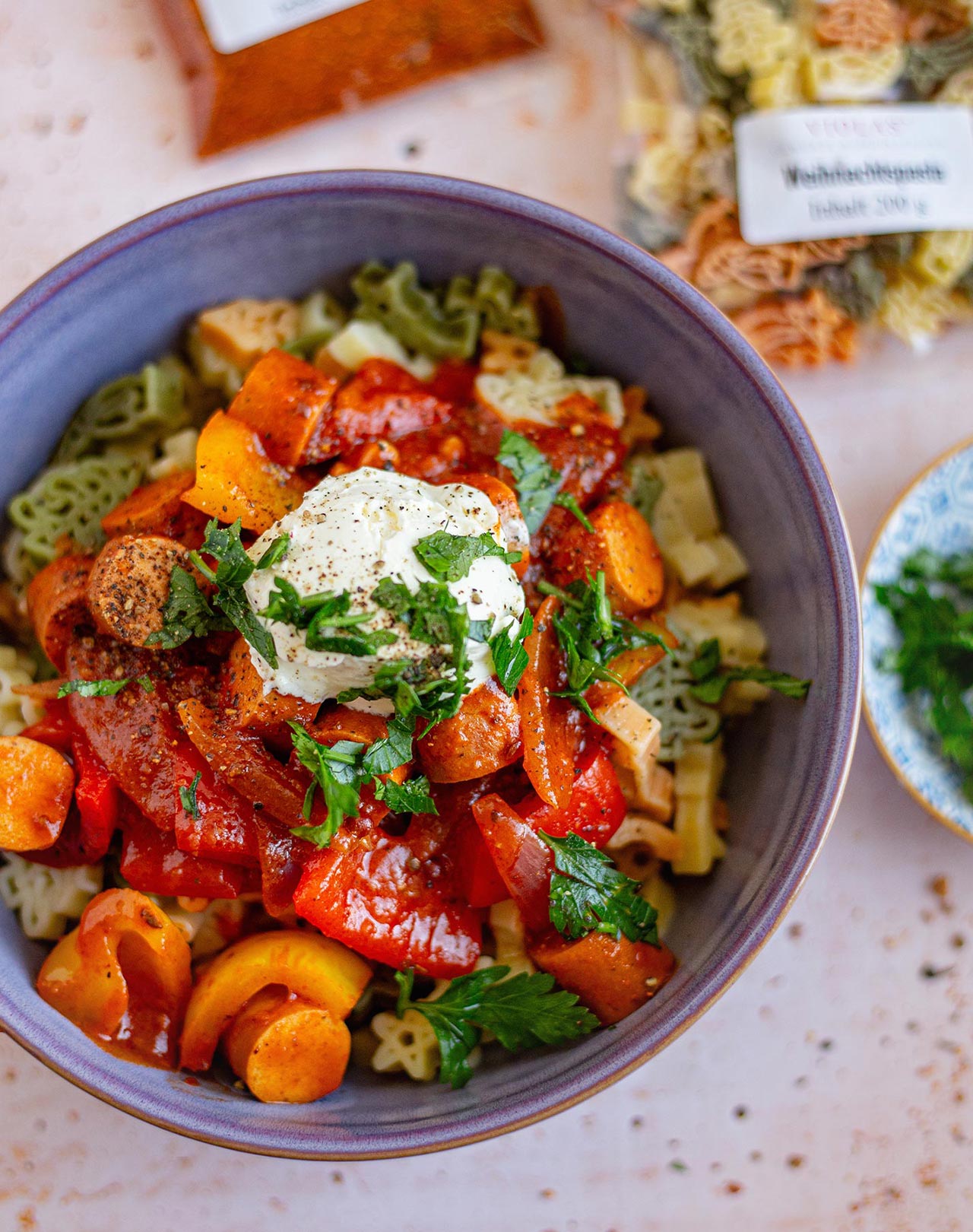Nudelmischung in 500 ml Wasser oder Brühe kurz aufkochen und 9 min köcheln lassen. Die fertige Pasta nach Geschmack mit Crème fraîche und Parmesan verfeinern.