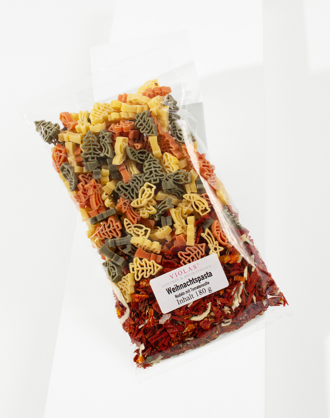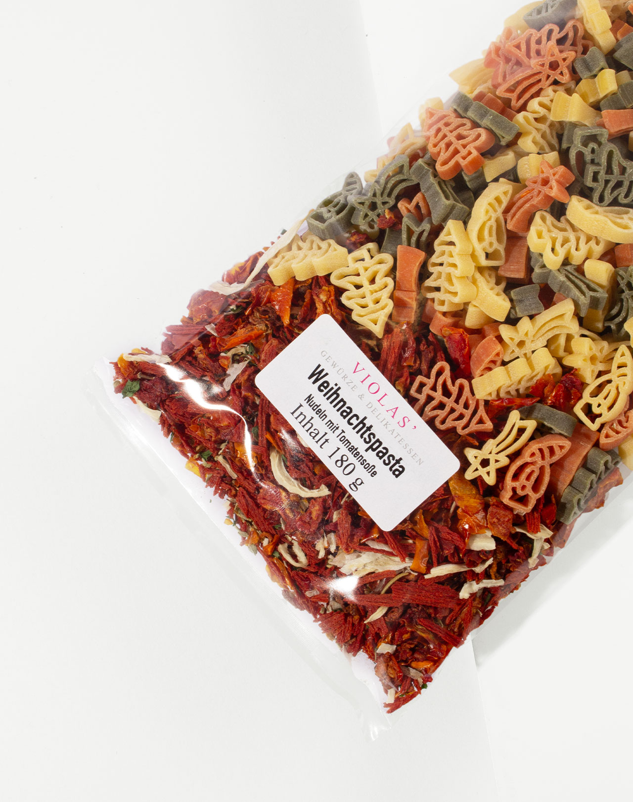 Entdecken Sie festliche Freude mit VIOLAS’ Weihnachtspasta! Lustige Nudeln in Form von Weihnachtsbäumen, Weihnachtsmännern und Sternen, verbunden mit schon fertiger Tomatensoße. Ein kulinarisches Highlight und unterhaltsame Familienaktivität zugleich. Lassen Sie die Kinder kreativ werden und die Vorfreude auf die festliche Zeit erleben. Auch eine schöne Geschenkidee!