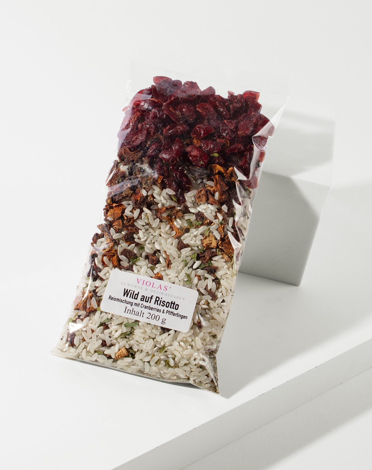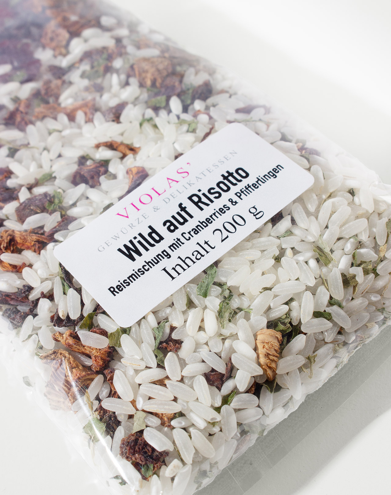 Edler Arborio Reis macht dieses Risotto so herrlich cremig! Die Reismischung ist mit Cranberries, Pfifferlingen, Wacholderbeeren und Rosmarin gewürzt und wird so zum idealen Begleiter für Wildgerichte. Die Menge ergibt ein Hauptgericht für zwei Personen oder ist als Beilage für vier Personen ausreichend.