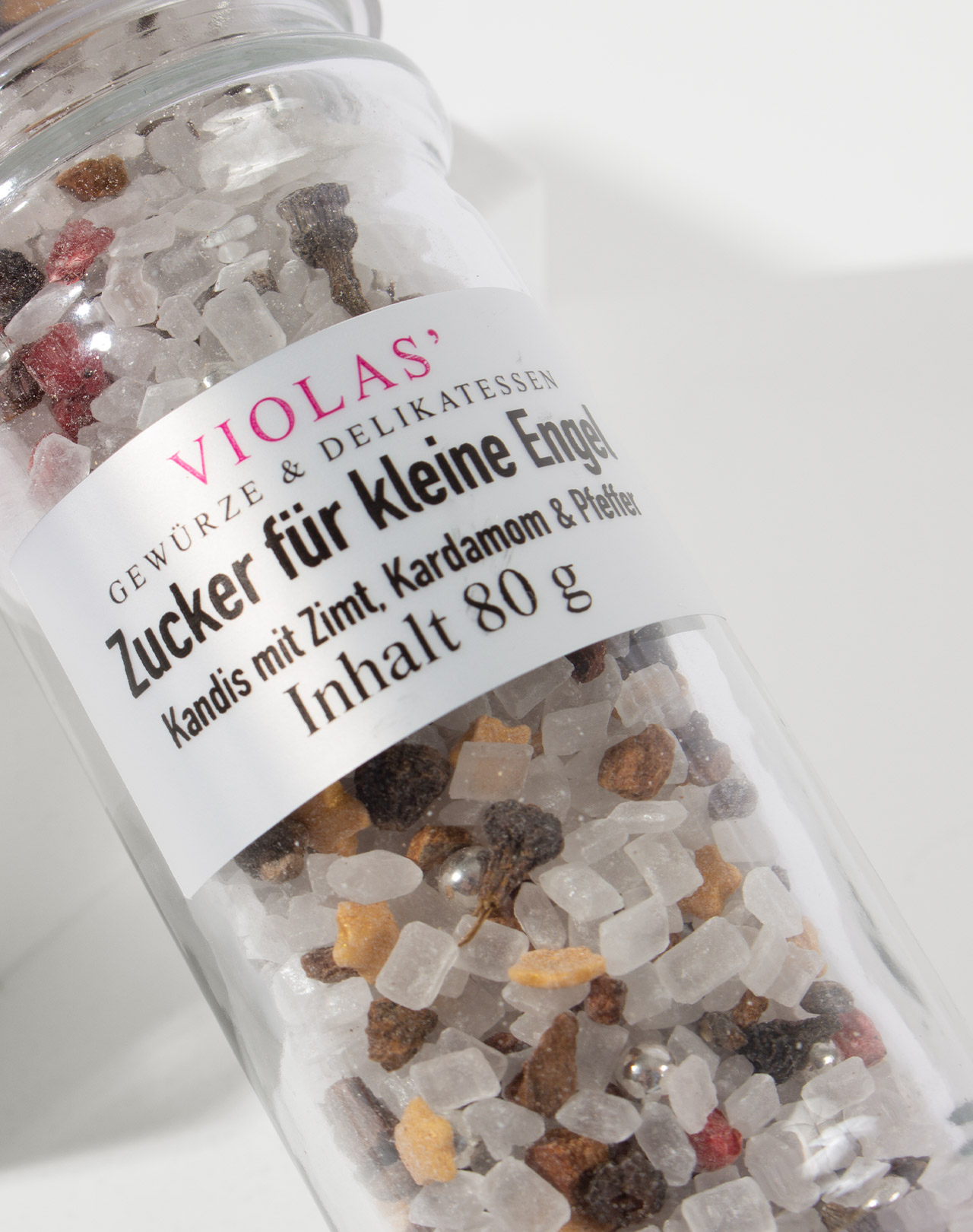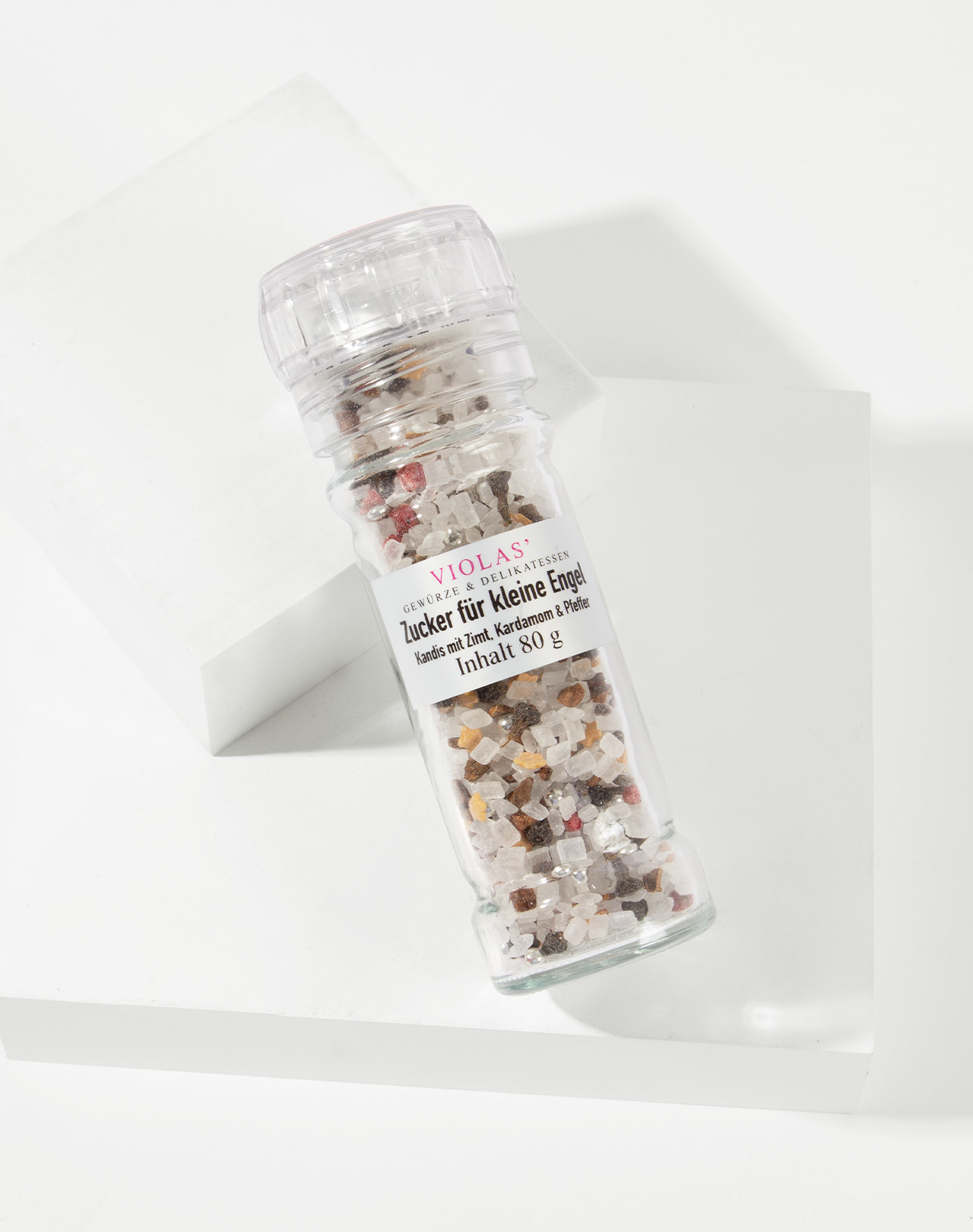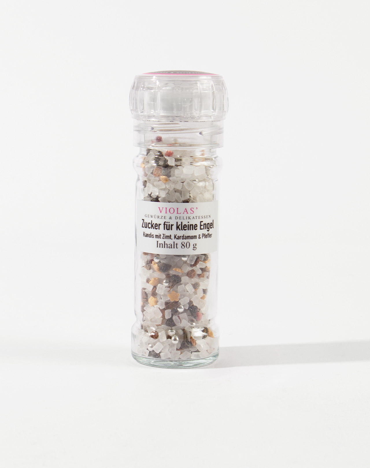 Diese Zuckermischung in der Mühle ist mit Cassia Zimt und Kardamom verfeinert und eignet sich wunderbar zum Würzen winterlicher Getränke und Speisen. Die dekorativen Liebesperlen und Zuckersterne machen die Mühle auch zu einem hübschen kleinen Geschenk für Ihren persönlichen Engel.