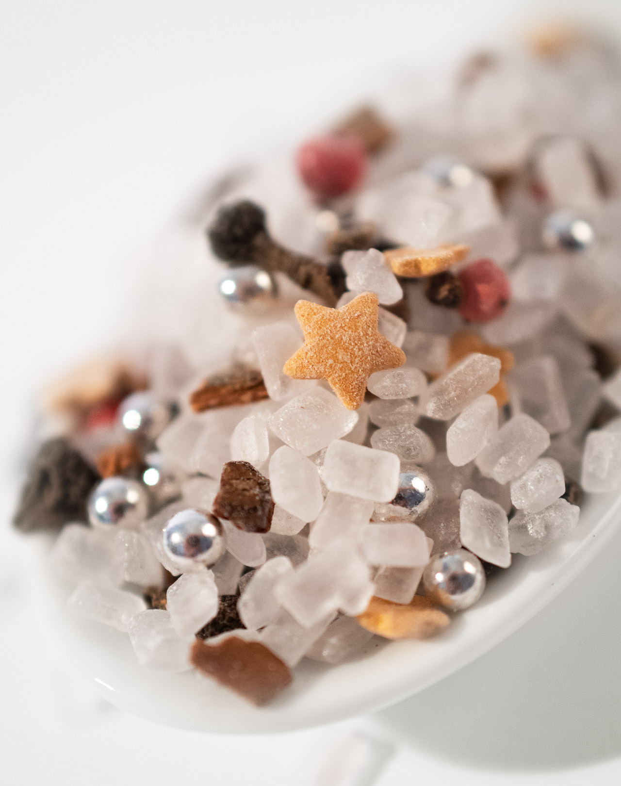 Kandis weiß 75 %, Liebesperlen silber (Zucker, Stärke (WEIZEN/Mais), Glukosesirup, Farbstoff E174, Gelatine), Cassia Zimt 4,5 %, Zuckersterne gelb (Zucker, Reismehl, ERDNUSSöl, Kartoffelstärke, Aroma, Farbstoff: 160a), Zimtblüte 3,8 %, Kardamom 2,6 %, Pfeffer rosa 1,5 %.