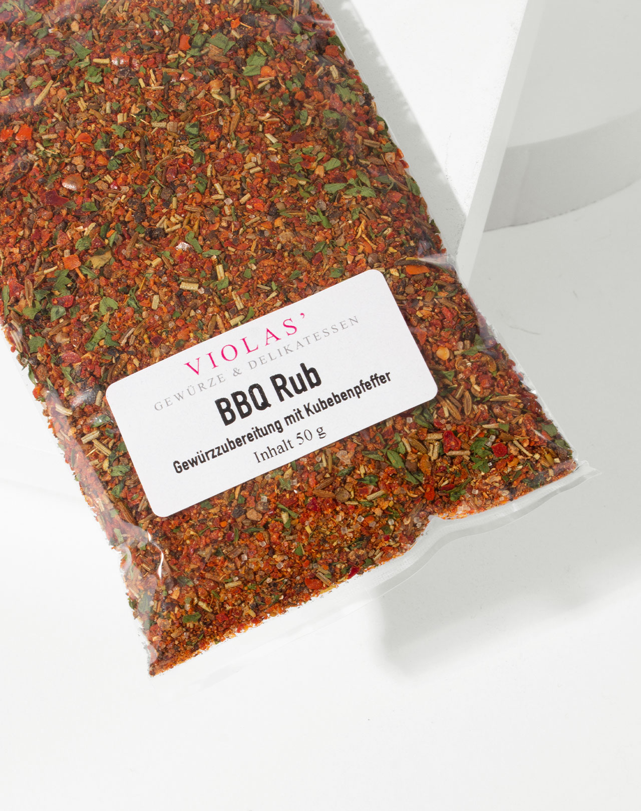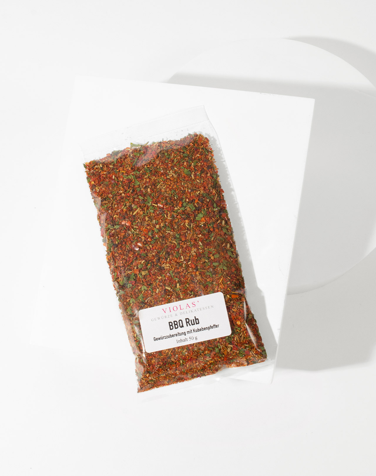 Das Besondere an BBQ Rubs ist nicht nur der würzige Geschmack, sondern die leckere Kruste, mit der das gewürzte Grillfleisch, Kurzgebratene oder der Braten überzogen wird. Meersalz ist nur sparsam enthalten, so wird das Fleisch nicht trocken; Kandiszucker unterstützt die Krustenbildung. Paprika, Kubebenpfeffer, Cumin, Chili, Knoblauch sind hier die geschmackgebenden Komponenten. Die Kräuter vorher sanft ins Fleisch einmassieren oder mit etwas Pflanzenöl – ggf. mit Senf, einem Spritzer Essig oder Bier verfeinern – zu einer Marinade verrühren.