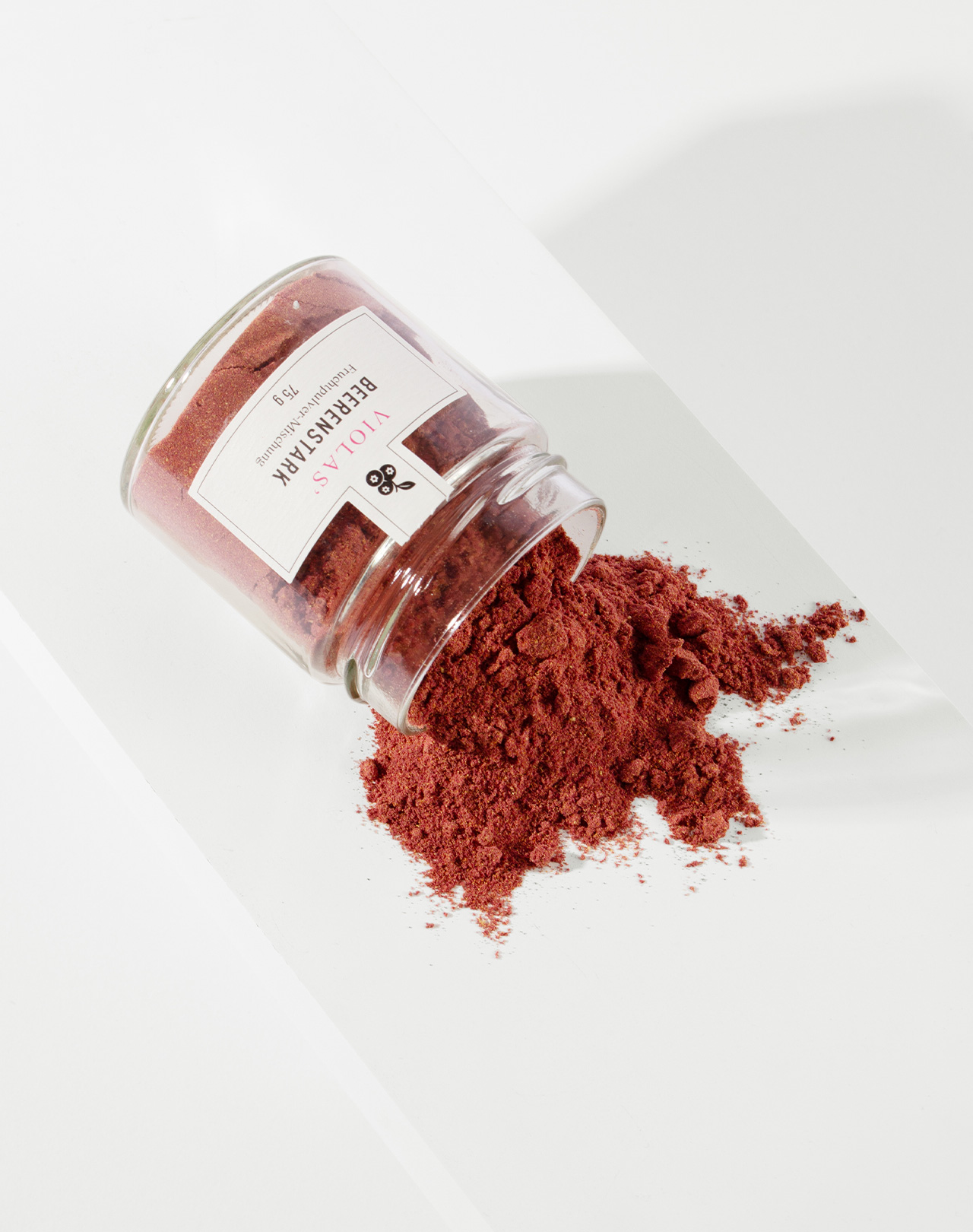 Aroniabeerenpulver, Heidelbeerpulver (Heidelbeere 40%, Maltodextrin, Säureregulator: Zitronensäure E330), Himbeerpulver (Himbeere 50%, Maltodextrin, Säureregulator: Zitronensäure E330), Hagebuttenpulver, Ingwerpulver