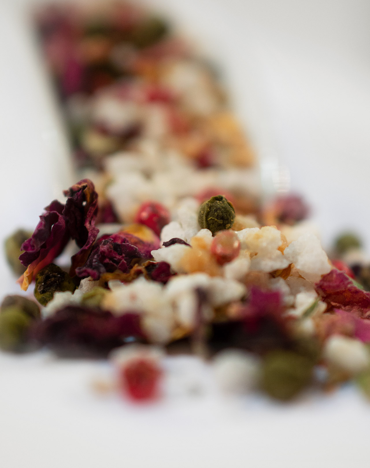 Vanille-Sahnezucker (Zucker, Karamellzuckersirup, Aromen), grüner Pfeffer, Rosa Pfeffer, Rosenblütenblätter