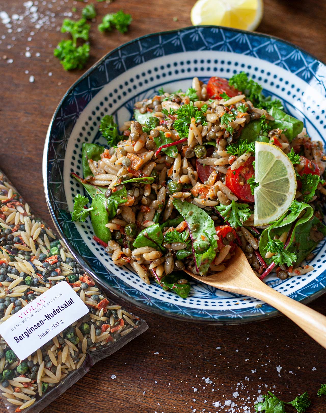 Diese Mischung aus nussigen Berglinsen und Kritharaki, den kleinen griechischen Reiskornnudeln, ist ausgesprochen lecker: Wir haben den Mix mit Thymian, Basilikum und feinen Gemüsestückchen mediterran abgeschmeckt – so lässt sich daraus mit einer Vinaigrette schnell ein sättigender Salat zaubern, den Sie ganz nach Gusto mit knackigem Gartengemüse, Schafskäse oder frischen Kräutern ergänzen können.