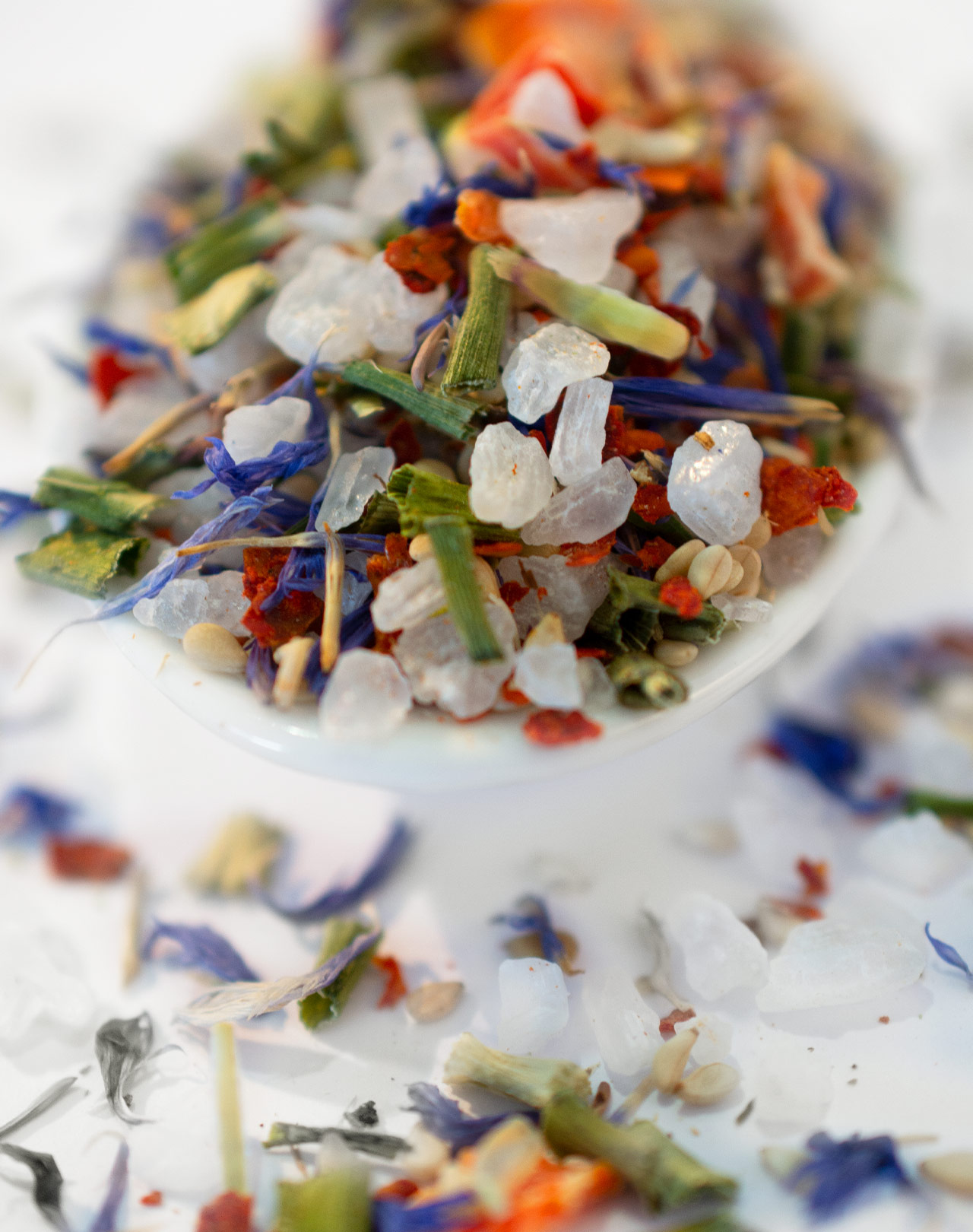 Meersalz, SESAM, Karotten, Chili, Schnittlauch, Kornblumenblüten blau