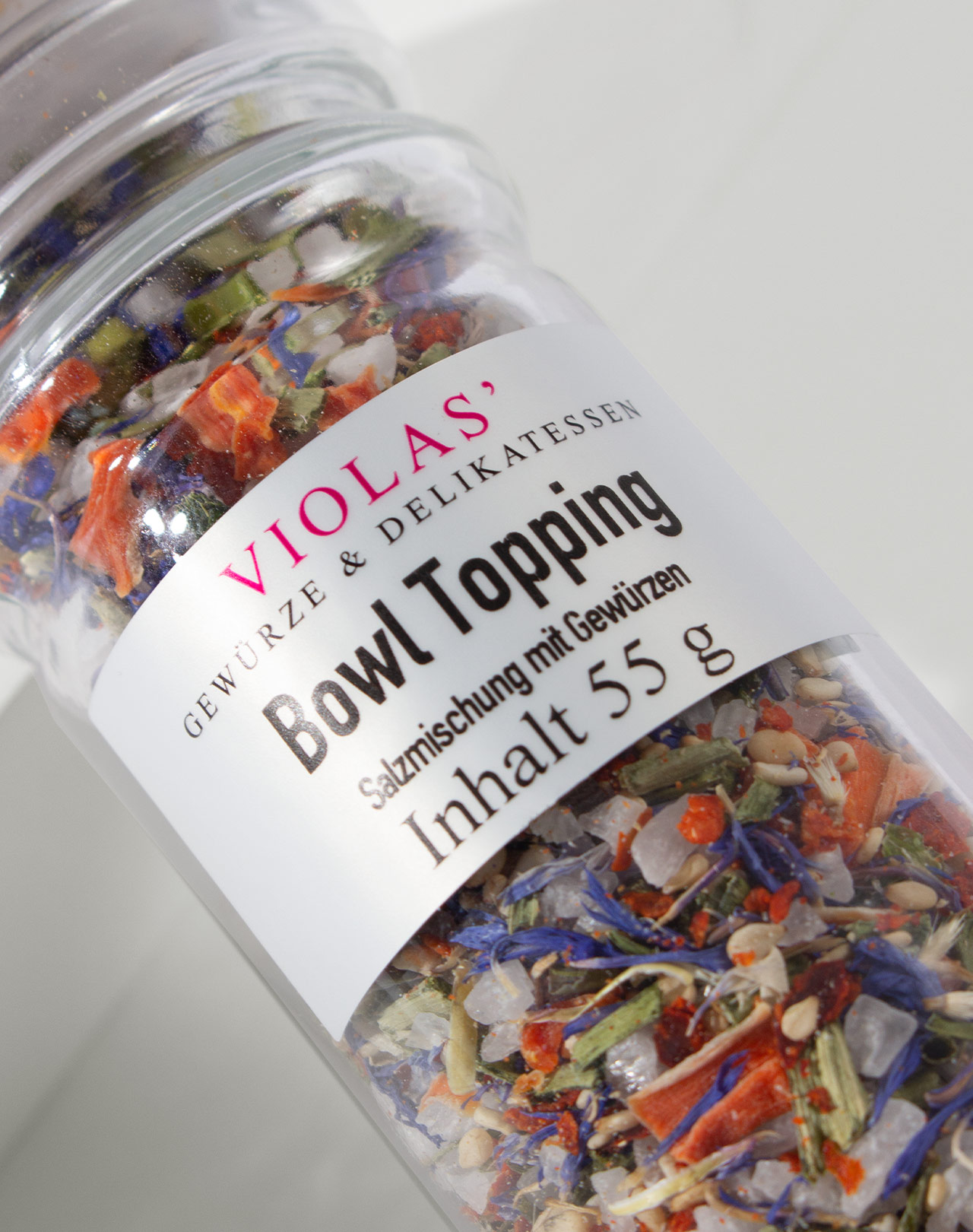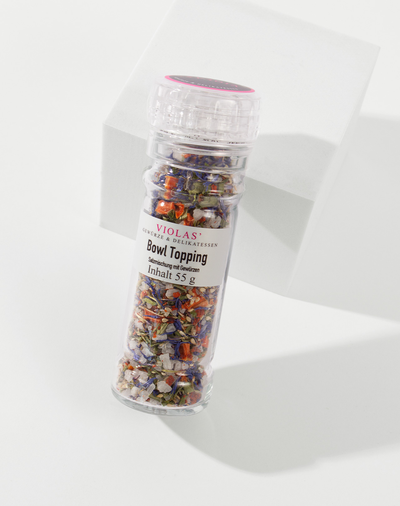 Egal, ob vegetarisch oder mit Fleisch oder Fisch, diese Mischung aus grobem Meersalz, Sesam, Karotten, Chili, Schnittlauch und blauen Kornblumenblüten rundet jedes Bowl-Gericht geschmacklich und optisch ab.