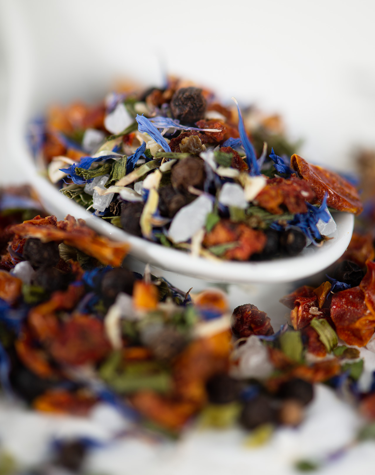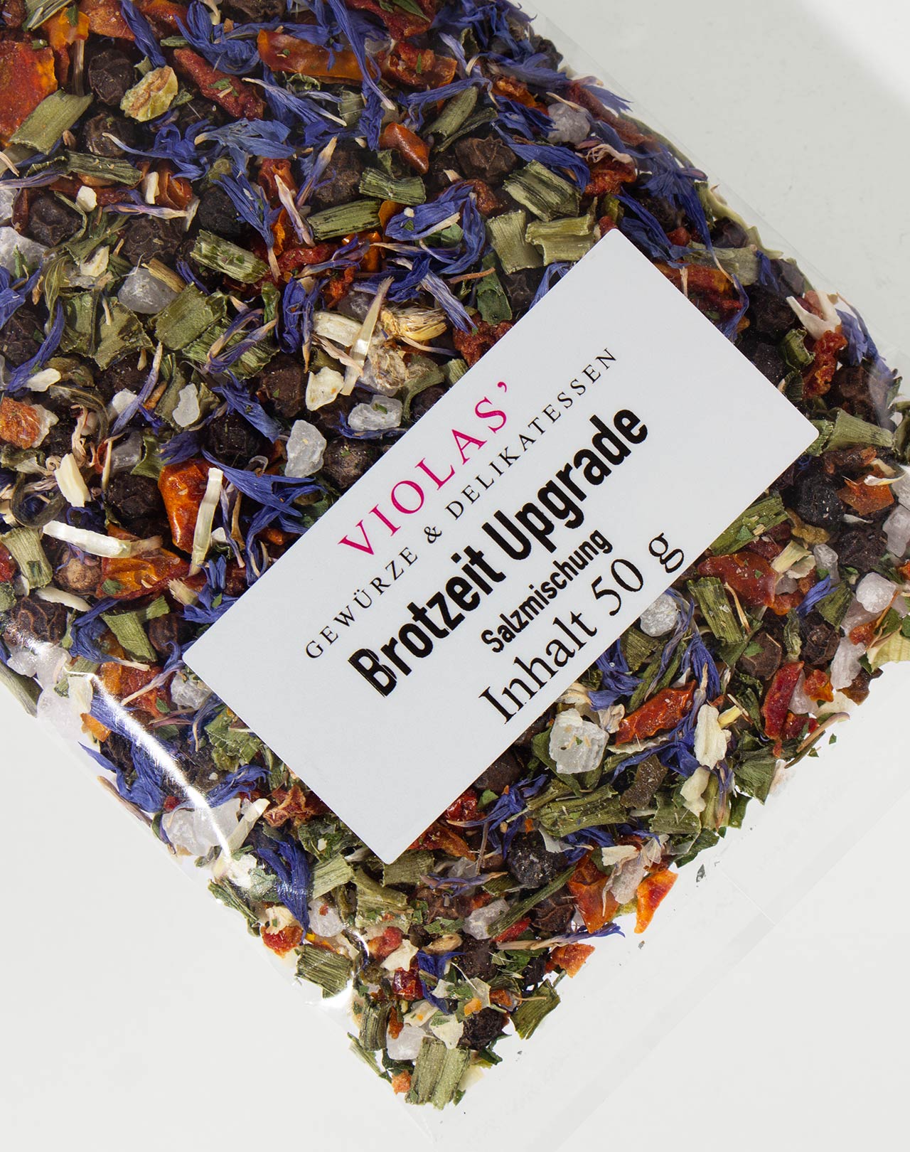 Salz, Pfeffer schwarz, Zwiebeln, Tomaten, Paprika rot, Paprika grün, Schnittlauch, Petersilie, blaue Kornblumen