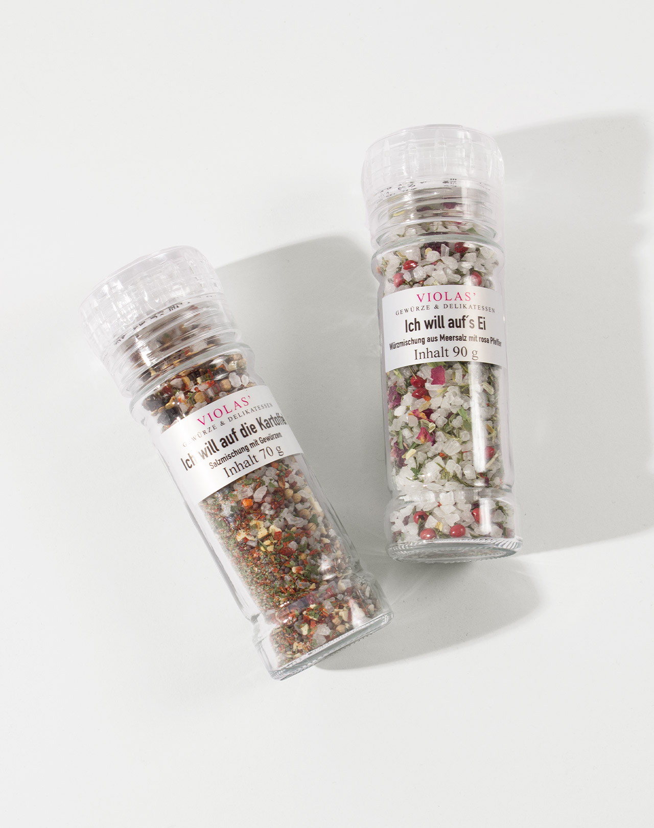 Mit diesem Duo aus VIOLAS’ »Ich will aufs Ei« und »Ich will auf die Kartoffel« erhalten Sie zwei Salzmischungen aus unserer Serie »Ich will« in einer attraktiven Glasmühle. Das edle Meersalz wird jeweils mit genau der Kombination aus Kräutern und Gewürzen versetzt, die es zu einem Spezialisten auf seinem Gebiet machen. In diesem Fall sind Meersalz, Pfeffer, Senf, Paprika u.a. ideal für alle Kartoffelgerichte. Während Meersalz, Lauch, rosa Pfeffer u.a. hervorragend den weichen Geschmack eines Spiegel-, Rühr- oder Frühstückseis unterstreichen.