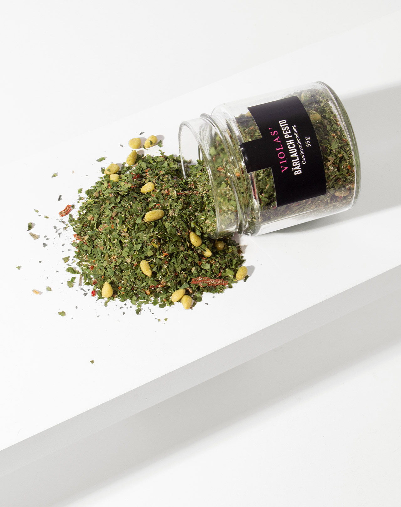 Bärlauch 21%, Pinienkerne 20%, Zwiebel, Knoblauch, Salz 10%, Tomatenflocken (Maisstärke), Basilikum, Paprika, Pfeffer. Kann Spuren von ERDNÜSSEN, NÜSSEN, SENF und SELLERIE enthalten.