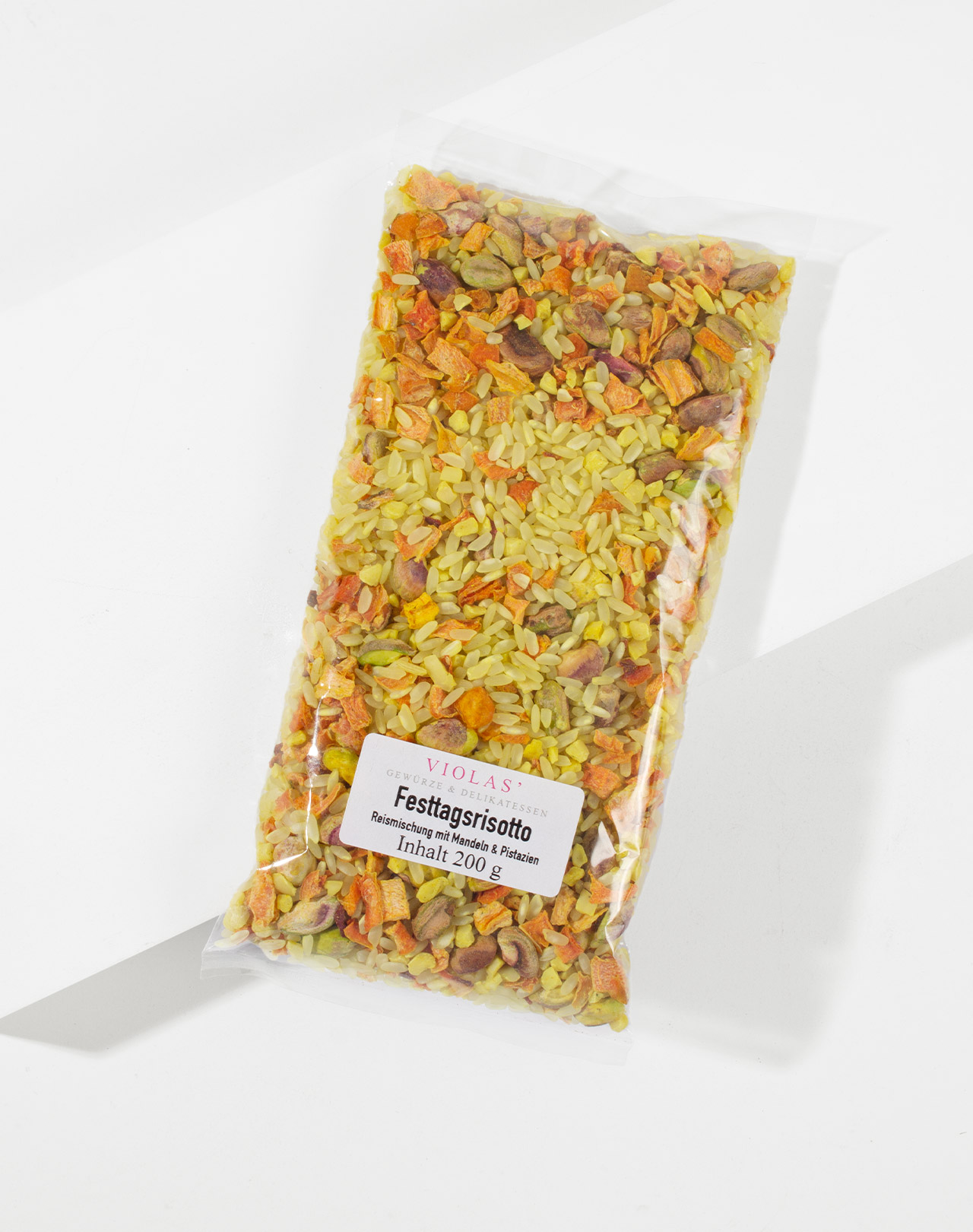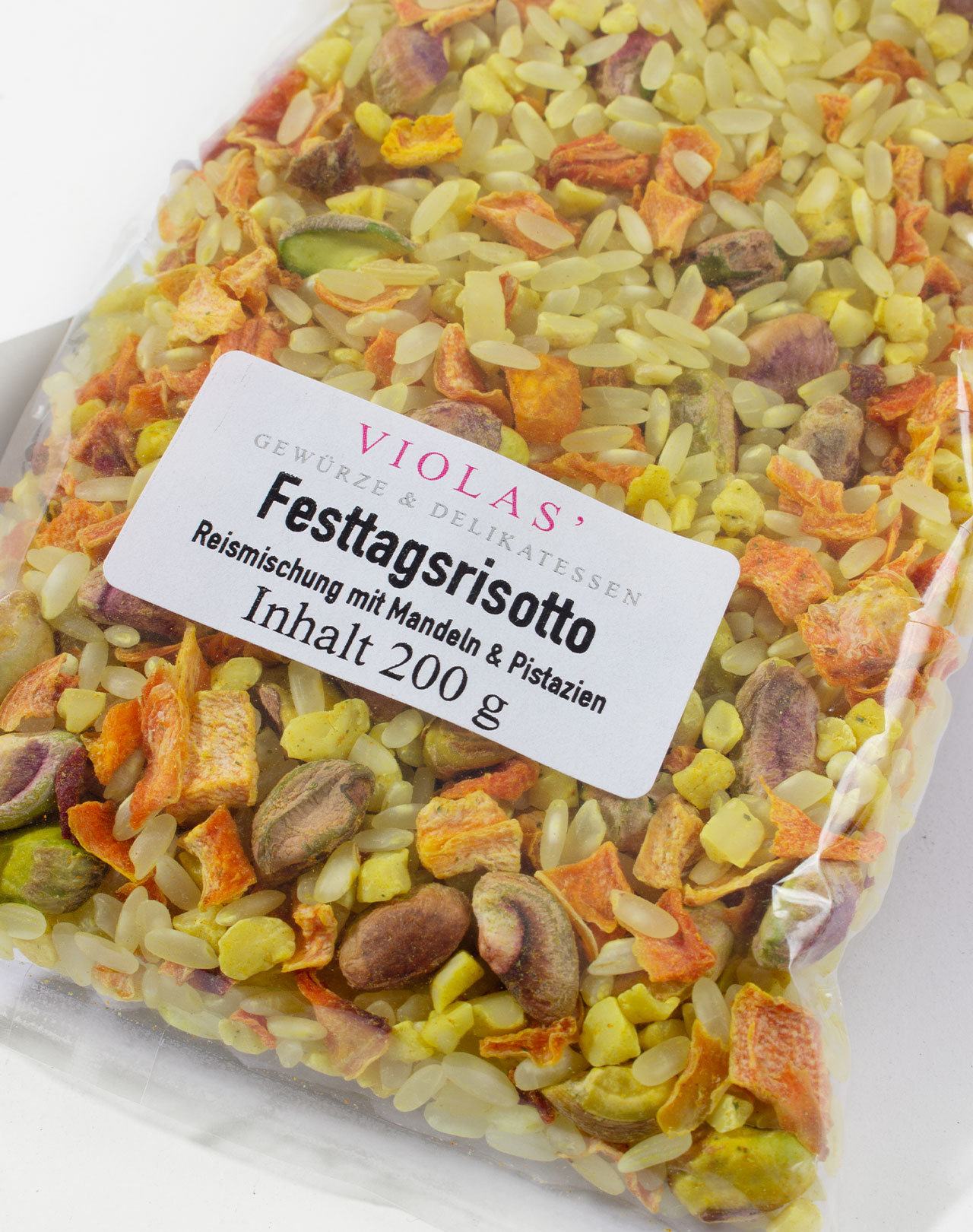 Risottoreis 80%, PISTAZIEN, MANDELN, Karotten, Paprika rot, Petersilie, Kurkuma, Zitronenöl.