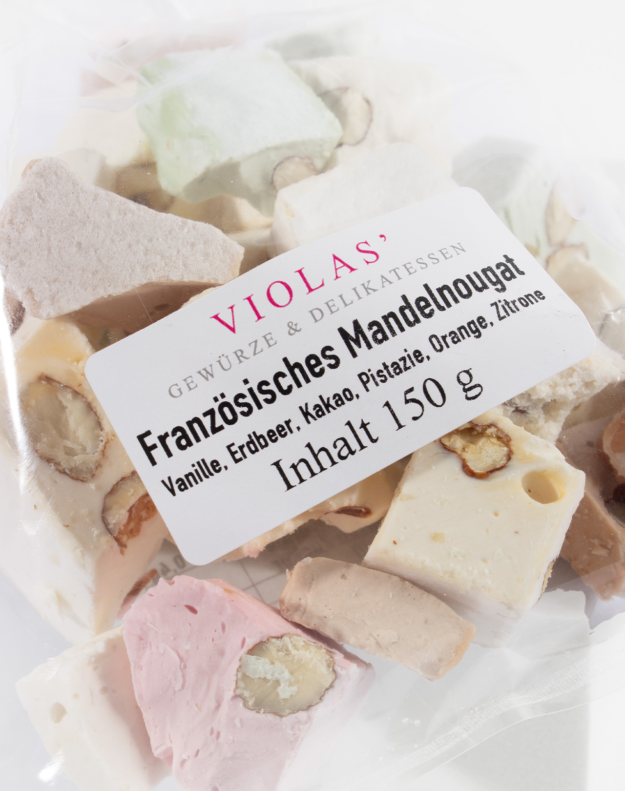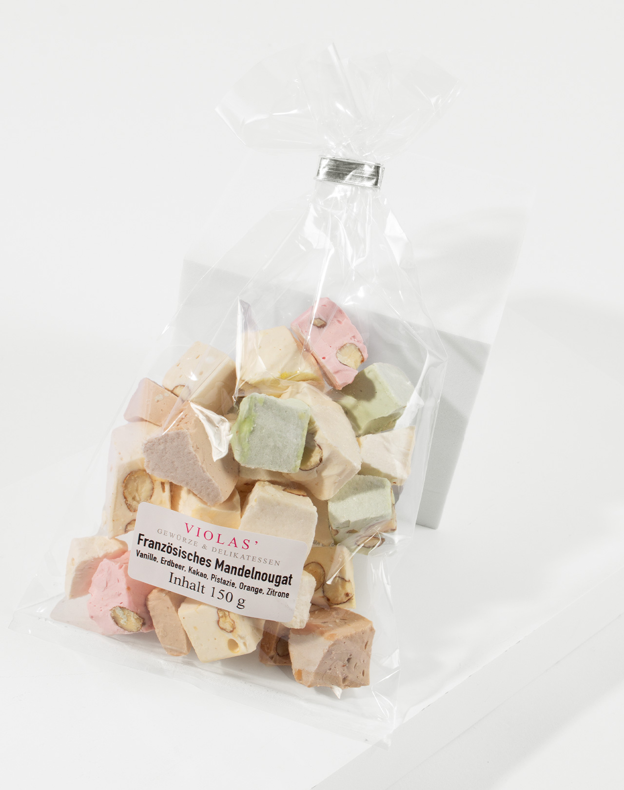 Entdecken Sie unser französisches Mandelnougat in einer verlockenden Mischung aus verschiedenen Sorten: Vanille, Pistazie, Erdbeer, Kakao, Orange und Zitrone. Unser Mandelnougat zeichnet sich durch seine weiche, weiße Konsistenz aus, die mit köstlich gerösteten Mandeln verfeinert ist. Die cremige Textur des Nougats verschmilzt zart auf der Zunge, während die gerösteten Mandeln einen herrlich nussigen Geschmack verleihen. Genießen Sie diese harmonische Kombination aus süß und nussig und lassen Sie sich von den verschiedenen Geschmacksrichtungen verführen.