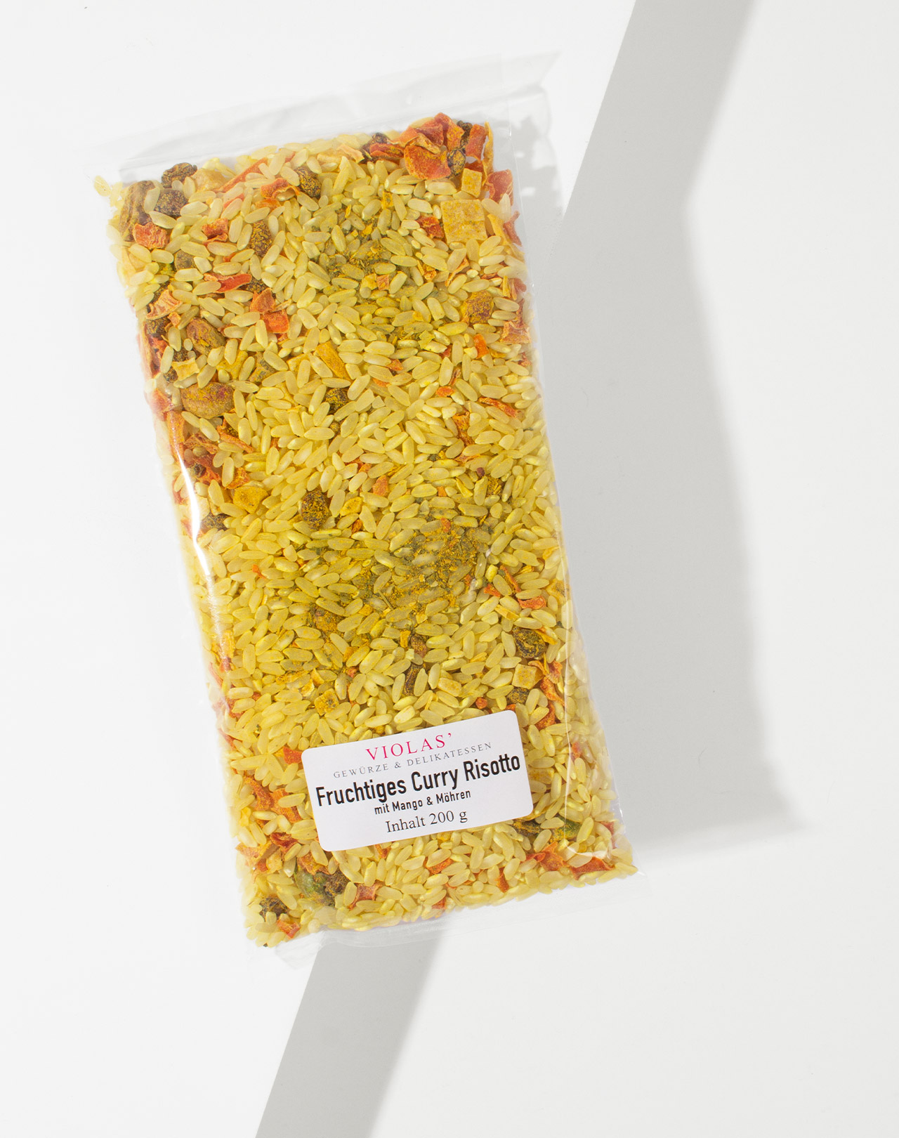 Risottoreis 73%, Mangowürfel 8,8%, Möhren 6,1%, PISTAZIEN, Curry 2,4% (Kurkuma, Coriander, Kichererbse, SENF, Pfeffer, Salz, Bockshornkleesamen, Knoblauch, SELLERIE, Chili, Zimt, Cumin ), Berberitzen, Zwiebeln, Petersilie.