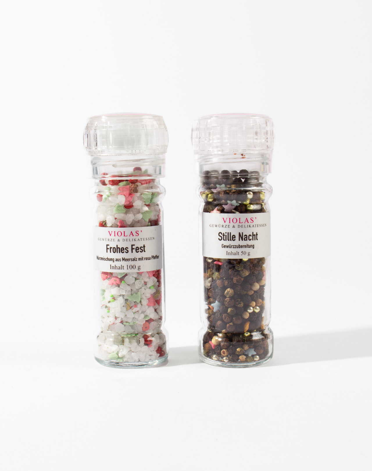 - VIOLAS’ Mühle »Stille Nacht« – Gewürzzubereitung mit weißem und schwarzen Pfeffer sowie festlicher Zuckerdeko
