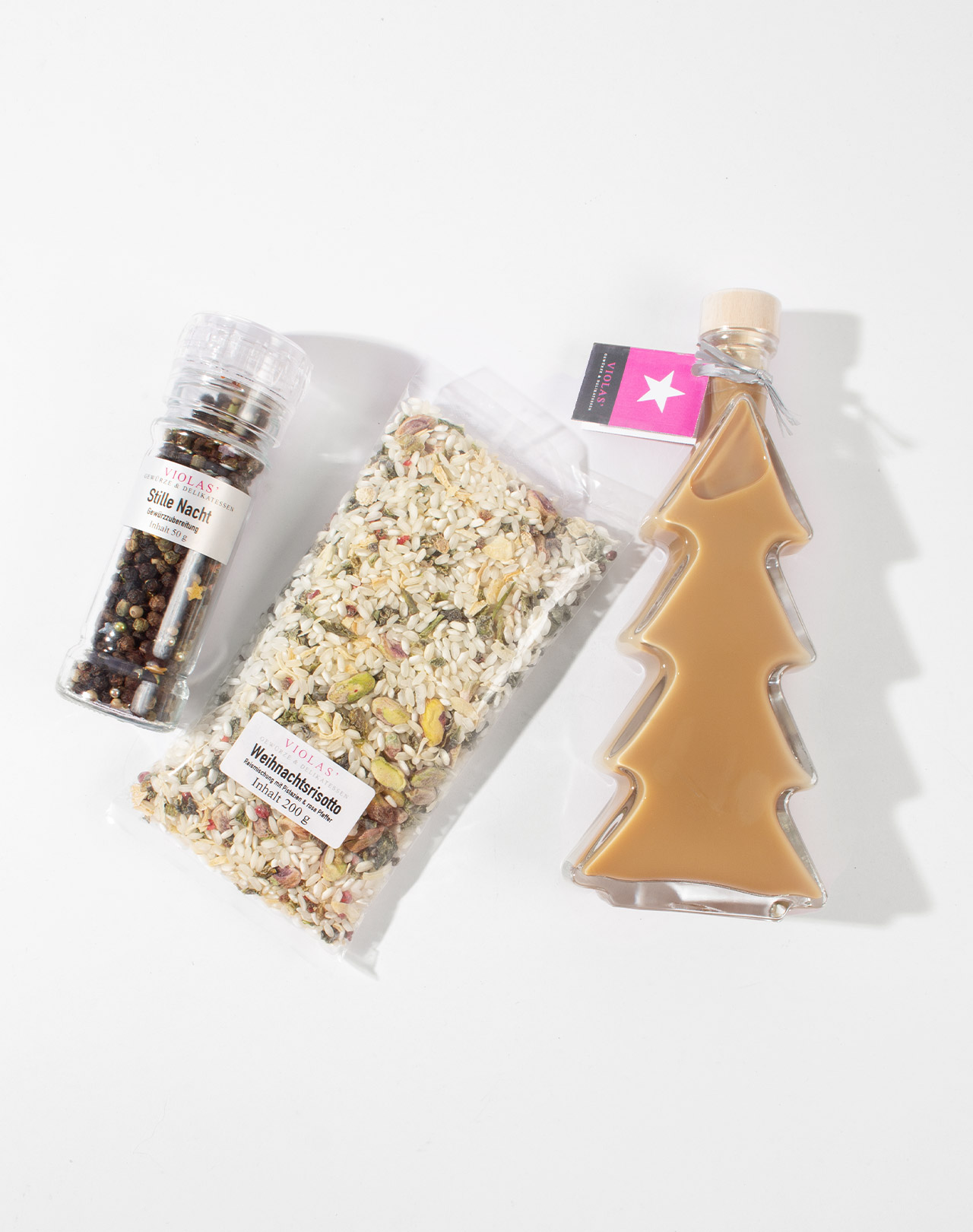 So kann man einen Adventssonntag herrlich genießen! Ein Gläschen »Nusskipferl Sahnelikör« aus der Tannenbaum-Flasche und dabei ein »Weihnachtsrisotto« kochen. Damit der Risotto-Genuss perfekt ist, enthält das Set die Pfeffermischung »Stille Nacht«. Dieses Genießer-Set ist stilvoll in einer weißen Papiertütre verpackt und wird mit einem hübschen Schleifenband geliefert.