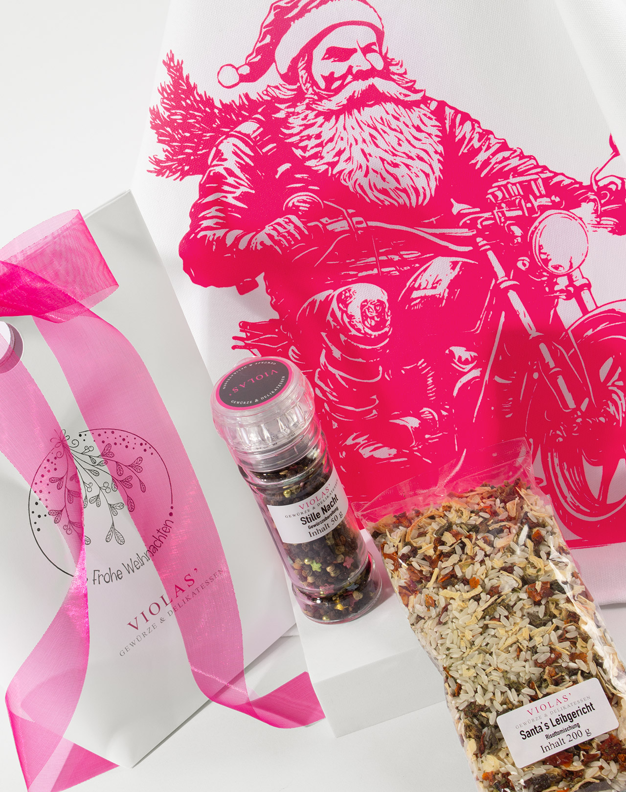 Das Genießer-Set »Santa Rocks!« bringt festliche Stimmung und cooles Design perfekt zusammen. Es enthält das stylische Geschirrtuch »Pink Santa«, auf dem der Weihnachtsmann in leuchtendem Pink auf einem Motorrad zu sehen ist – ein echter Hingucker in jeder Küche. Dazu gibt es die edle Gewürzmühle »Stille Nacht«, die mit weihnachtlichen Aromen Ihre Gerichte verfeinert, und die köstliche Risottomischung »Santa's Leibgericht«, die für ein cremiges, festliches Risotto sorgt. Geliefert mit einer schönen Geschenktüte mit Schleifenband, ist dieses Set das ideale Geschenk, um weihnachtliche Freude und kulinarischen Genuss zu verbreiten.
