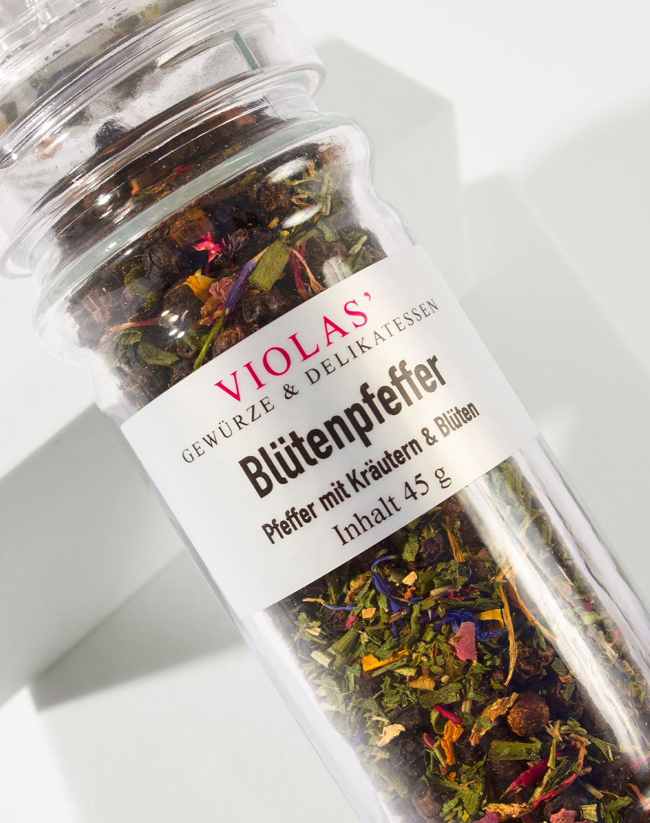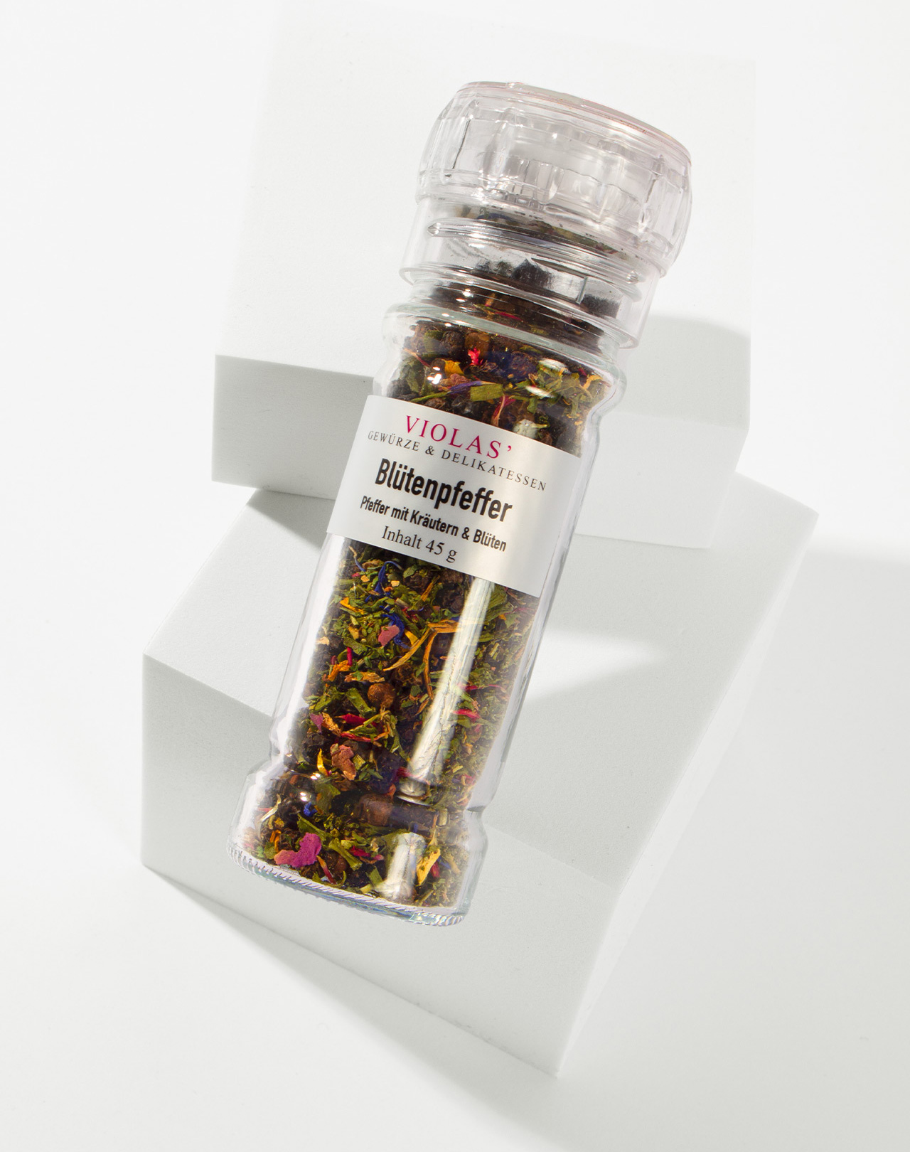 Eine Pfeffermühle mit einer Mischung aus schwarzem Pfeffer, Schnittlauch, Petersilie, Rosmarin und vielen Blütenblättern von blauen und roten Kornblumen sowie Rosenblätter und Ringelblumen ist ein Blickfang auf jedem gedeckten Tisch. Auch der Duft der ätherischen Öle aus frisch gemahlenem Pfeffer in Kombination mit einer blumigen Note aus den Blütenblättern ist wunderbar zu Käse und Salat.