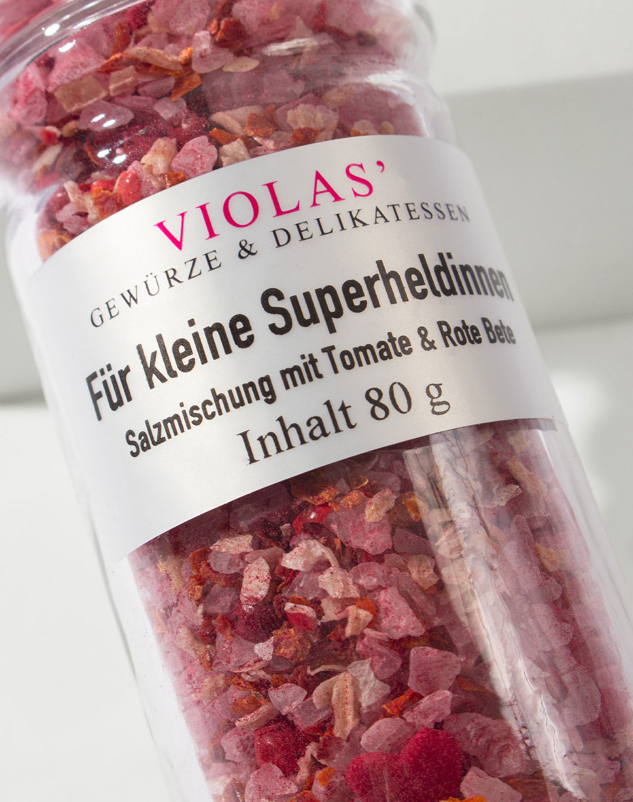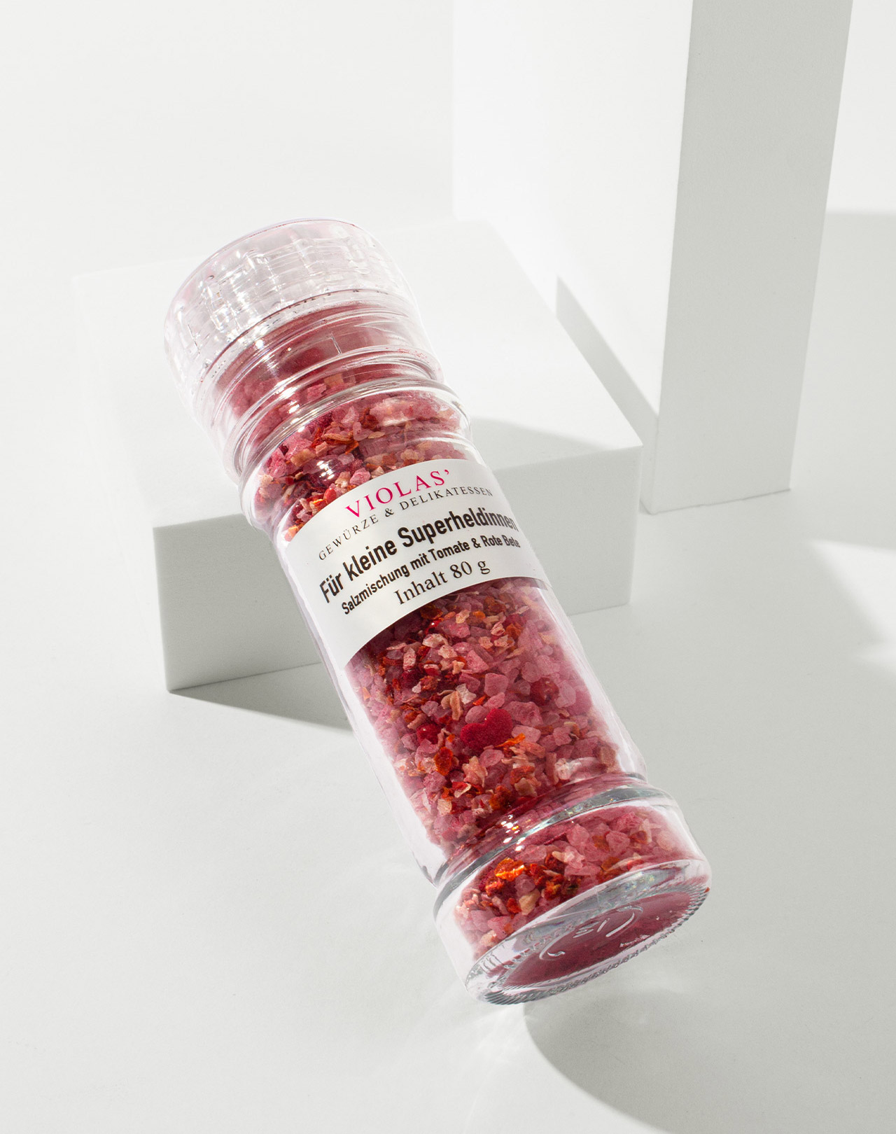 Langeweile ist nix für Superheldinnen! Bunt und würzig ist ihr Leben! Das beginnt schon beim Schulbrot und hört bei Pommes noch lange nicht auf. Diese Würzmischung enthält Meersalz, getrocknete Tomaten, Rosa Pfeffer, Rote Betepulver und ganz wichtig: rote Zuckerherzen. Optisch ein Riesenspaß und geschmacklich einfach topp.