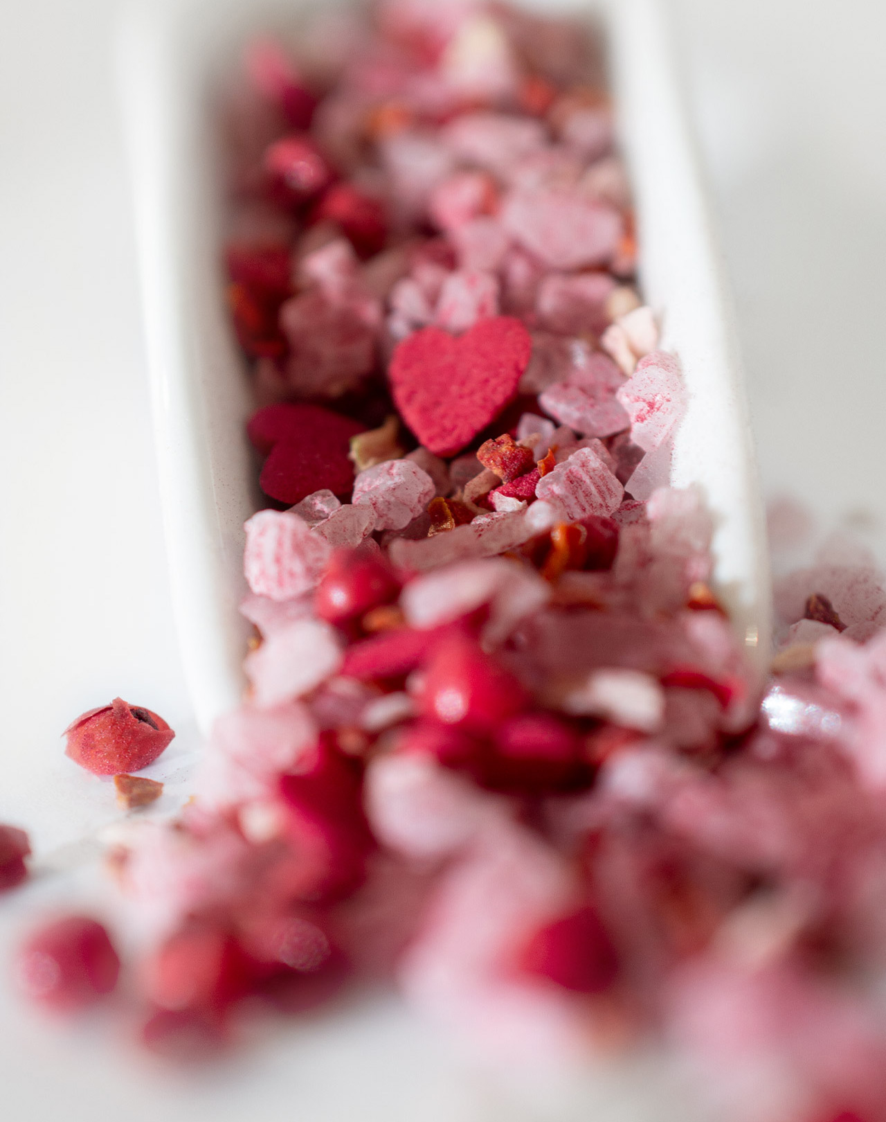 Meersalz 72%, getrocknete Tomaten 6%, Rosa Pfeffer, rote Zuckerherzen 6% (Zucker, Reismehl, Reisöl, Kartoffelstärke, Aroma, Farbstoffe: E120, E160a), Zwiebeln, Rote Betepulver (Kann Spuren von Erdnüssen enthalten)