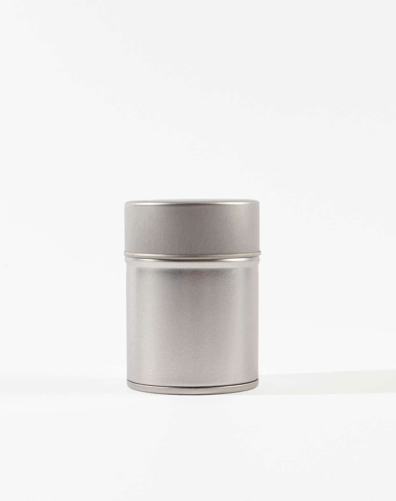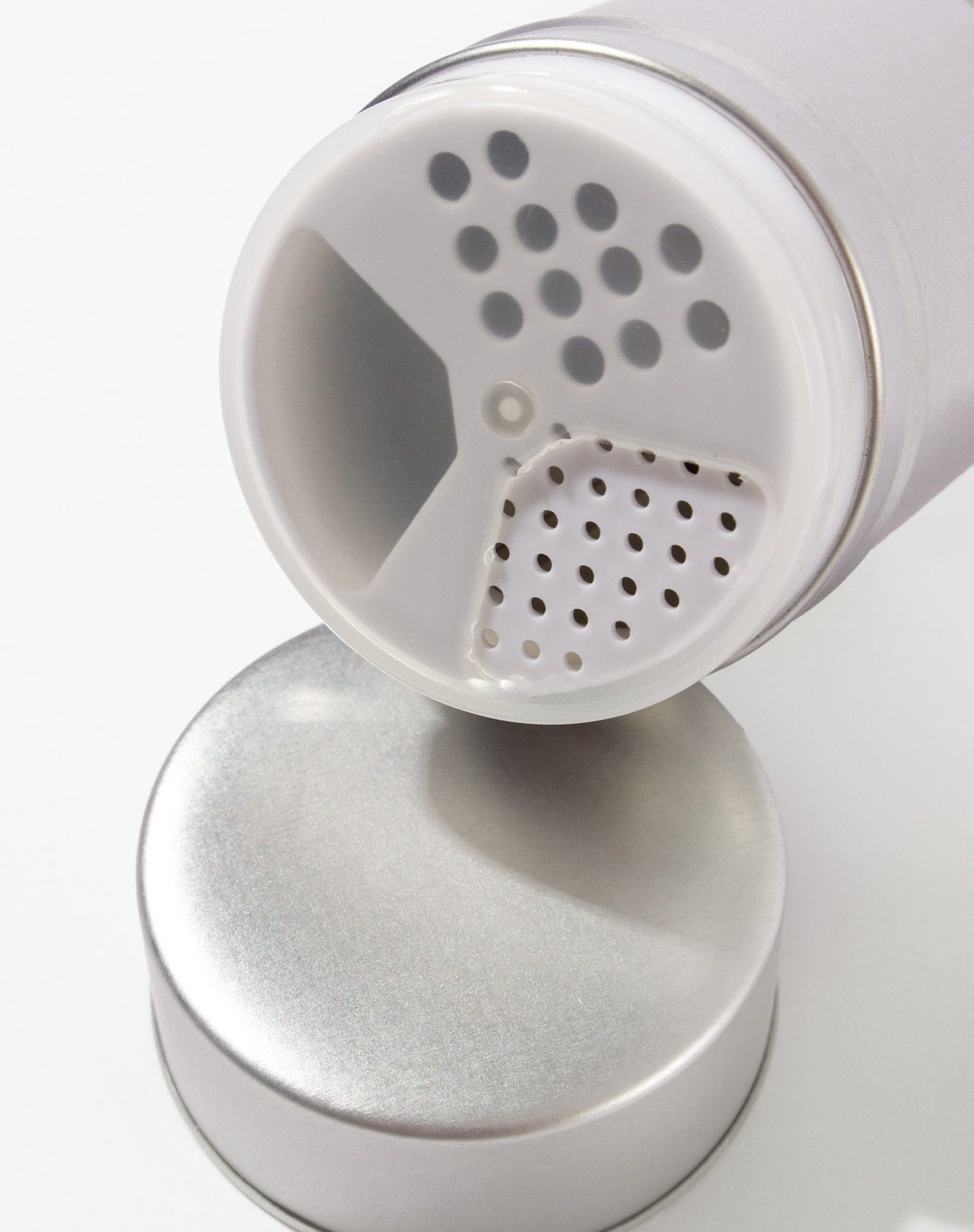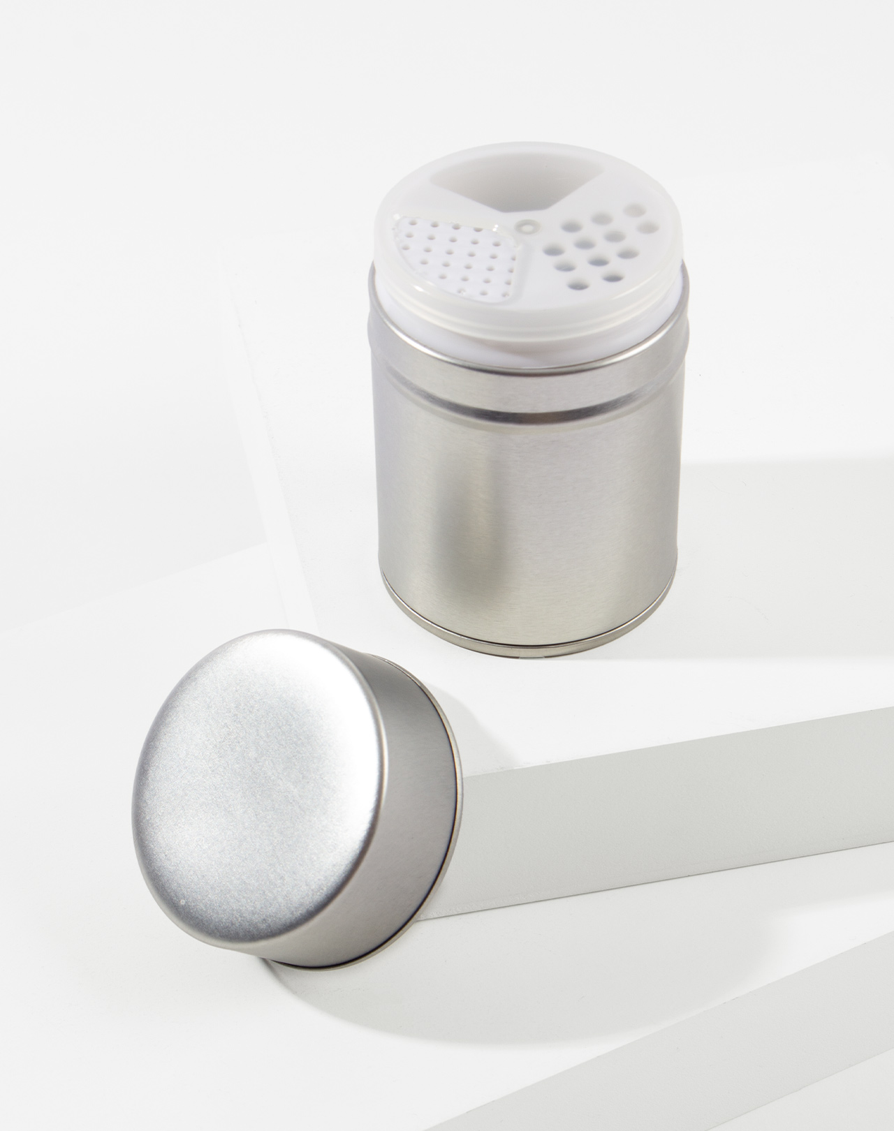 Runde Stülpdeckeldose aus Weißblech mit passendem Streueinsatz aus Kunststoff, der dreifach verstellt werden kann - Ideal zur Aufbewahrung von Gewürzen und Kräutern.