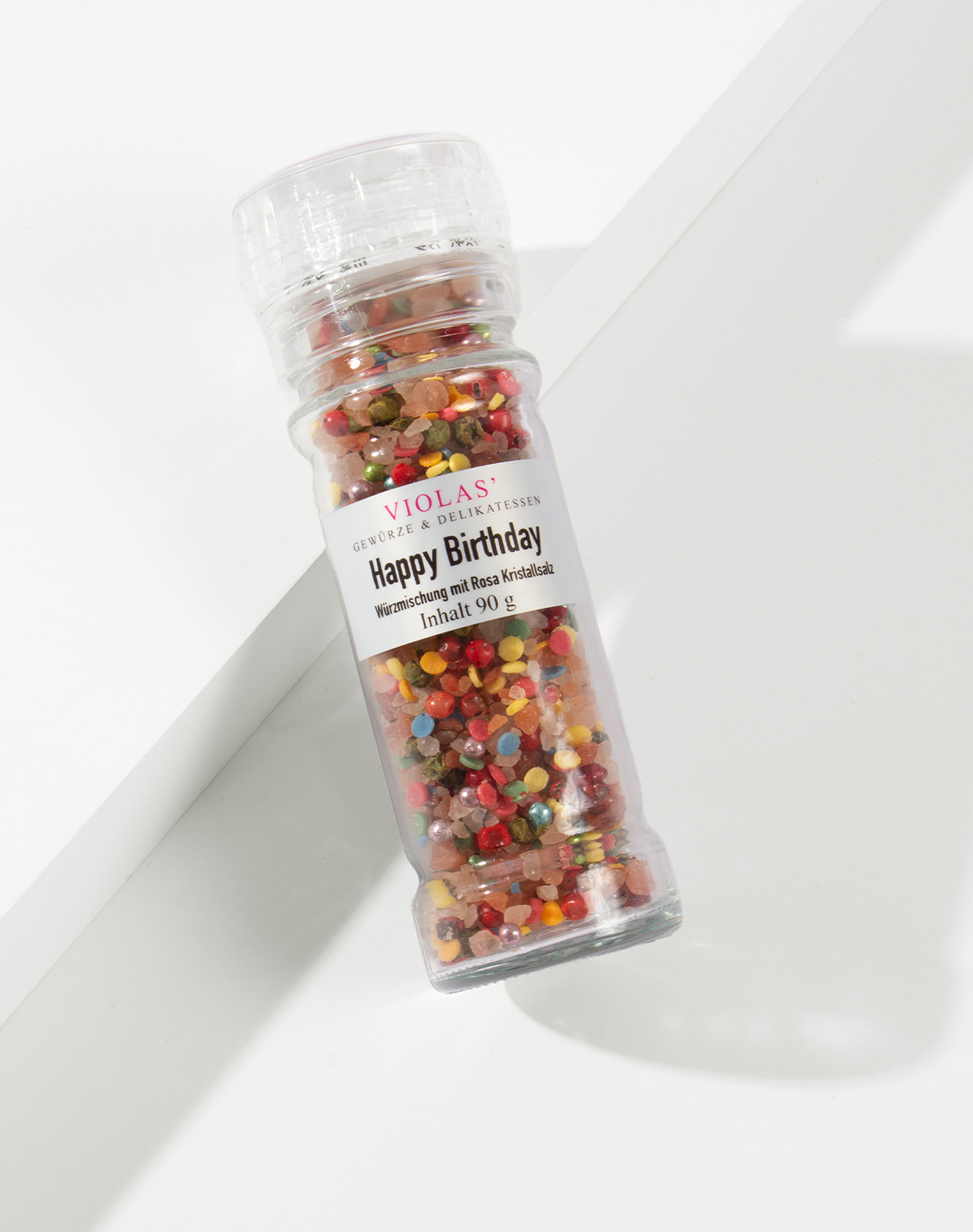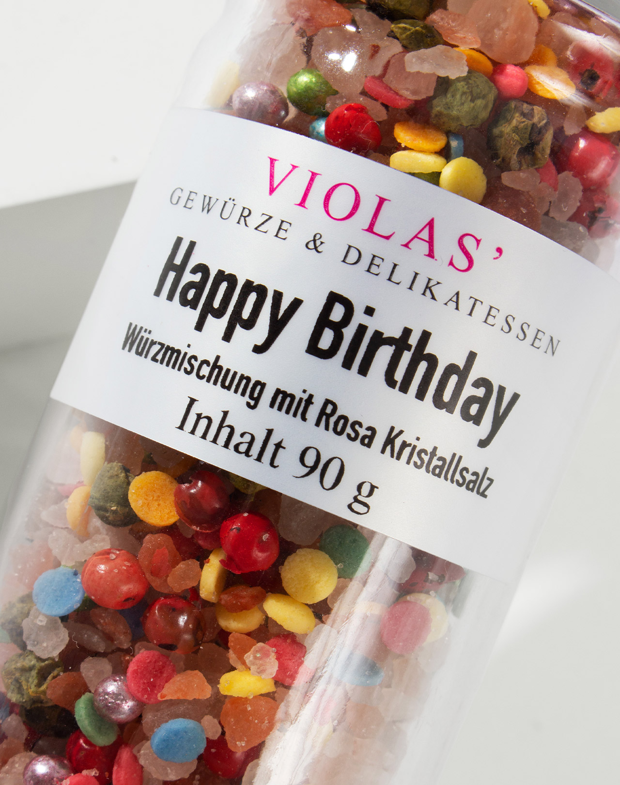 Die Salzmischung »Happy Birthday« enthält Kristallsalz und zwei Sorten Pfeffer. Außerdem ist sie mit bunten Liebesperlen und Zuckerkonfetti festlich geschmückt. Ein hübsches Geschenk für Geburtstagskinder – herzlichen Glückwunsch. Zum besonderen Hingucker wird die Mühle mit einem personalisierten Etikette.