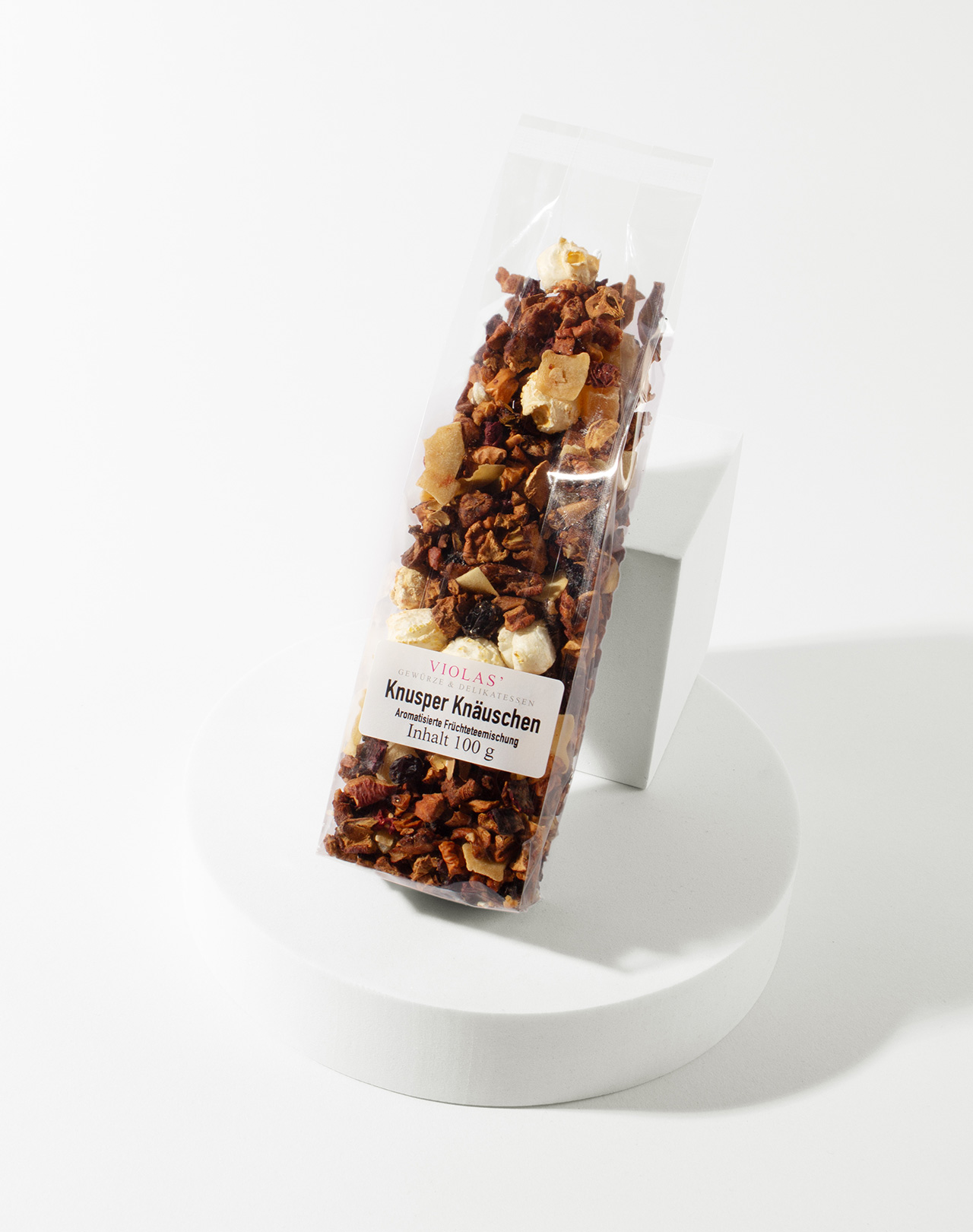 Eine Tasse mit dampfendem Tee schafft eine herrliche Auszeit vom Trubel der Vorweihnachtszeit. Unsere Teemischung mit Apfel, Ananas und Papaya eine liebliche Fruchtkomponente. Mandelkrokant und Kokoschips verschaffen dem Tee eine nussige Note. Entspannung pur!