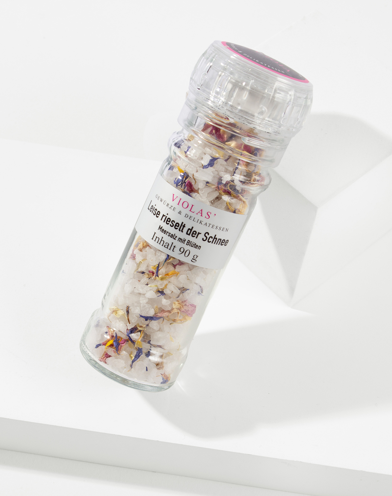 Leise rieselt der Schnee – diese zauberhafte Würzmischung aus feinem Meersalz und zarten Blüten bringt nicht nur Geschmack, sondern auch eine festliche Optik auf den Tisch. Perfekt, um winterliche Gerichte stilvoll abzurunden und den Speisen einen besonderen, weihnachtlichen Touch zu verleihen!
