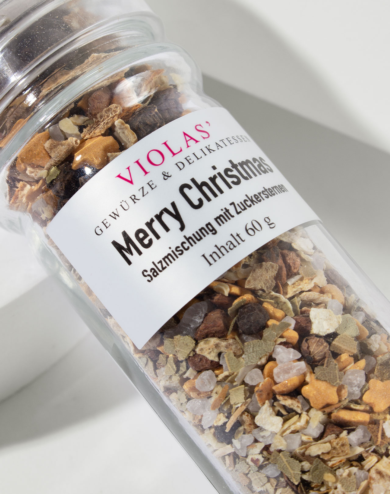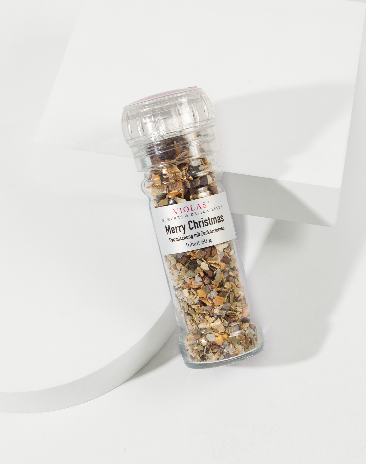 Eine Salzmischung mit Pfeffer, Piment, Lorbeer und Zwiebeln, Zitronenschale, Cassiazimt und ist ideal geeignet, um Rotkohl, Wild oder einen festlichen Braten zu würzen. Weil die Mischung außerdem kleine goldene Zuckersterne enthält, muss sie nicht in der Küche bleiben, sondern ist ein origineller Hingucker zum Nachwürzen auf der Festtafel.