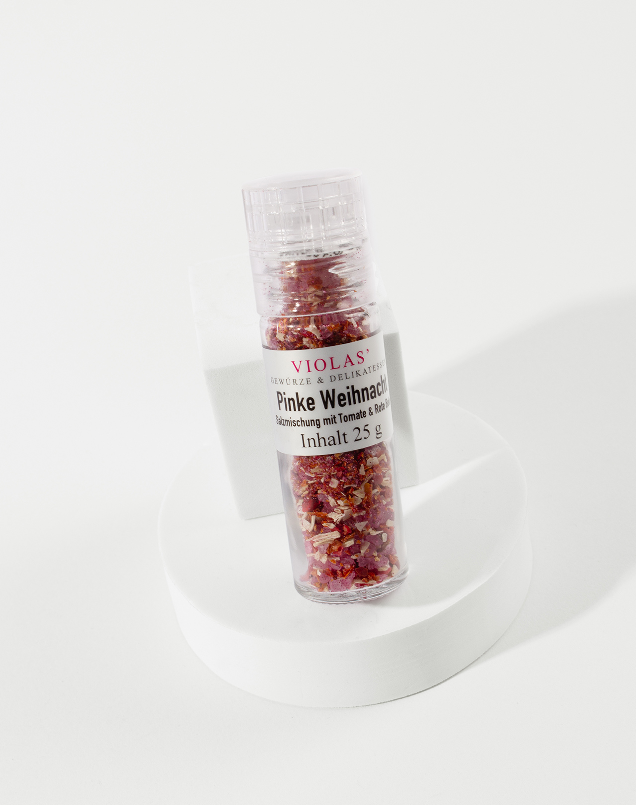 Unsere Mini-Mühle »Pinke Weihnacht« ist ein toller Farbklecks auf Ihrer Weihnachtstafel. Die würzige Meersalzmischung enthält Tomaten, Rosa Pfeffer, Zwiebel und etwas Rote Bete. Richtig weihnachtlich wird es durch die kleinen Zuckerherzchen, die zwischen den Gewürzen und Zutaten herausschauen. Ein must have für die Festtage!