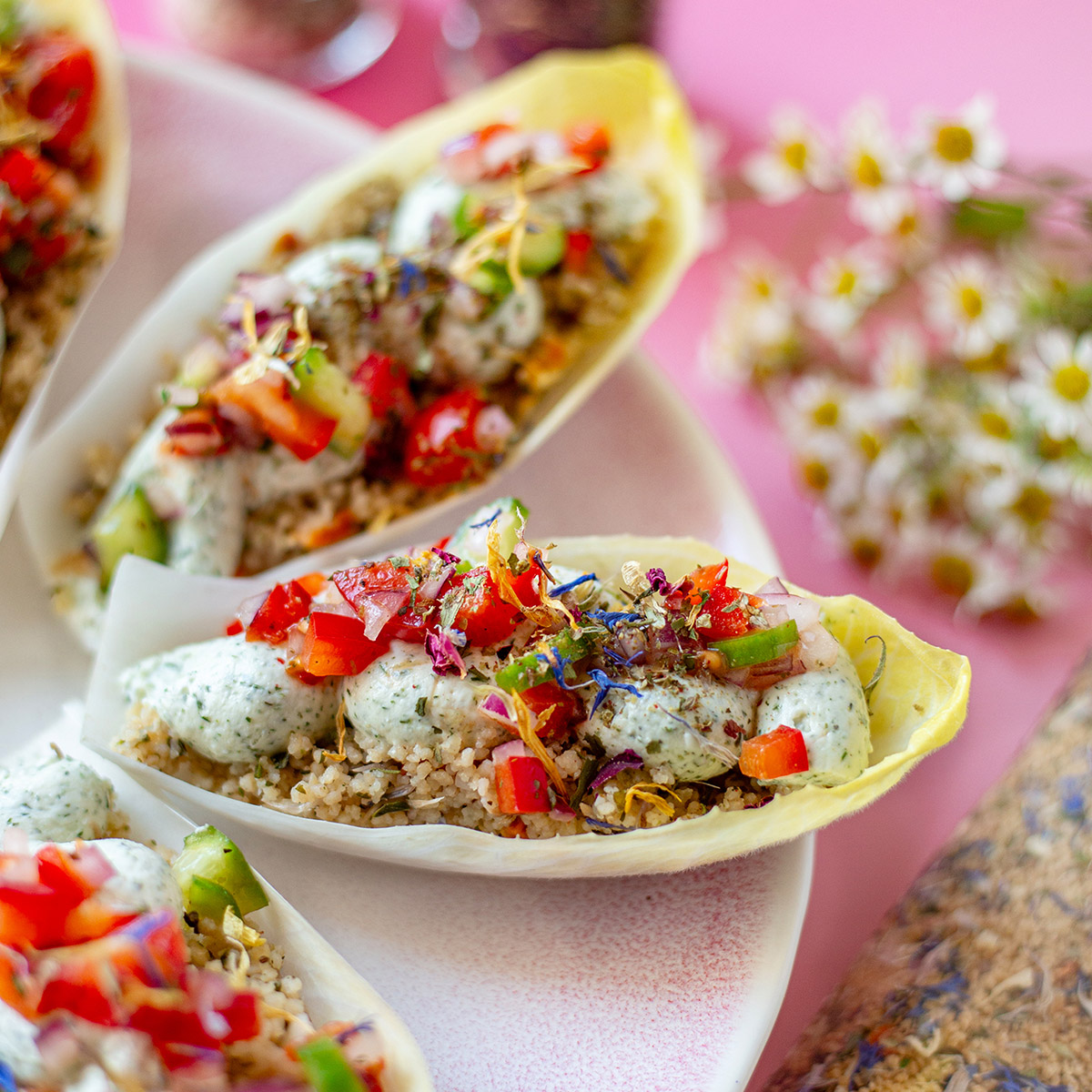 Knackiger Chicorée, aromatischer »Blütencouscous« und eine cremige Feta-Kräuter-Creme: Dieses Rezept ist perfekt, wenn du etwas Frisches und Besonderes fürs Buffet, Brunch oder als leichte Vorspeise suchst. Die gefüllten Chicorée-Blätter lassen sich super vorbereiten, sehen elegant aus und bringen mit Kräutern und Blüten eine schöne Frühlingsnote auf den Tisch.